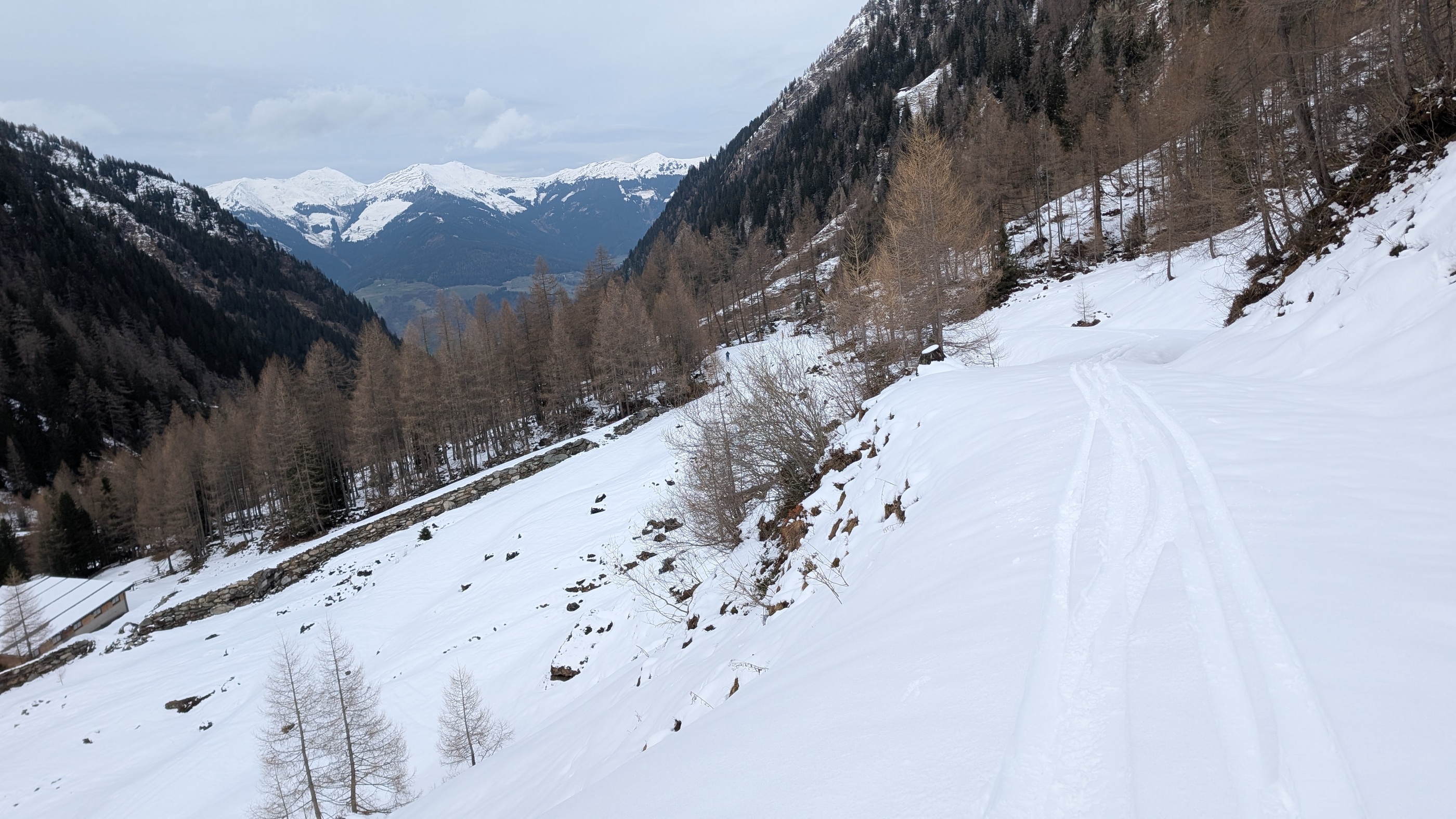 Dann geht es erstmal eher flach weiter. Man sieht es bereits an den Rutschungen von rechts: Der Schnee ist hier zunehmend durchfeuchtet.