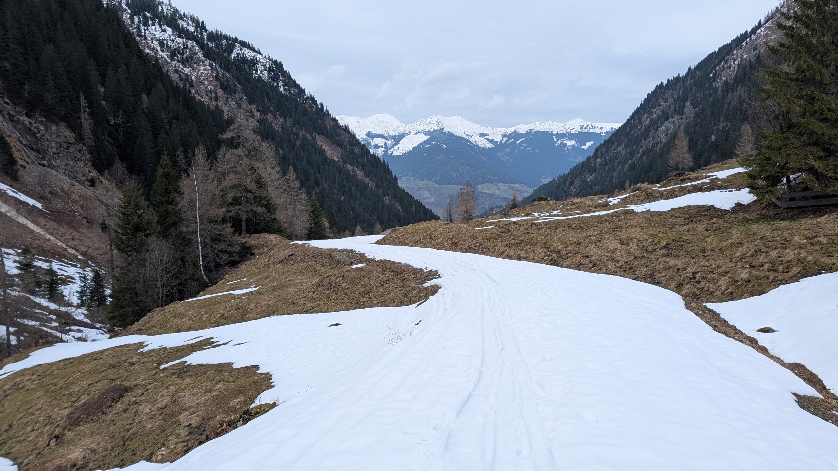 Auf Pappschnee geht es in gemächlichem Tempo hinab. Bis Niedernsill ist es noch ein weiter Weg.