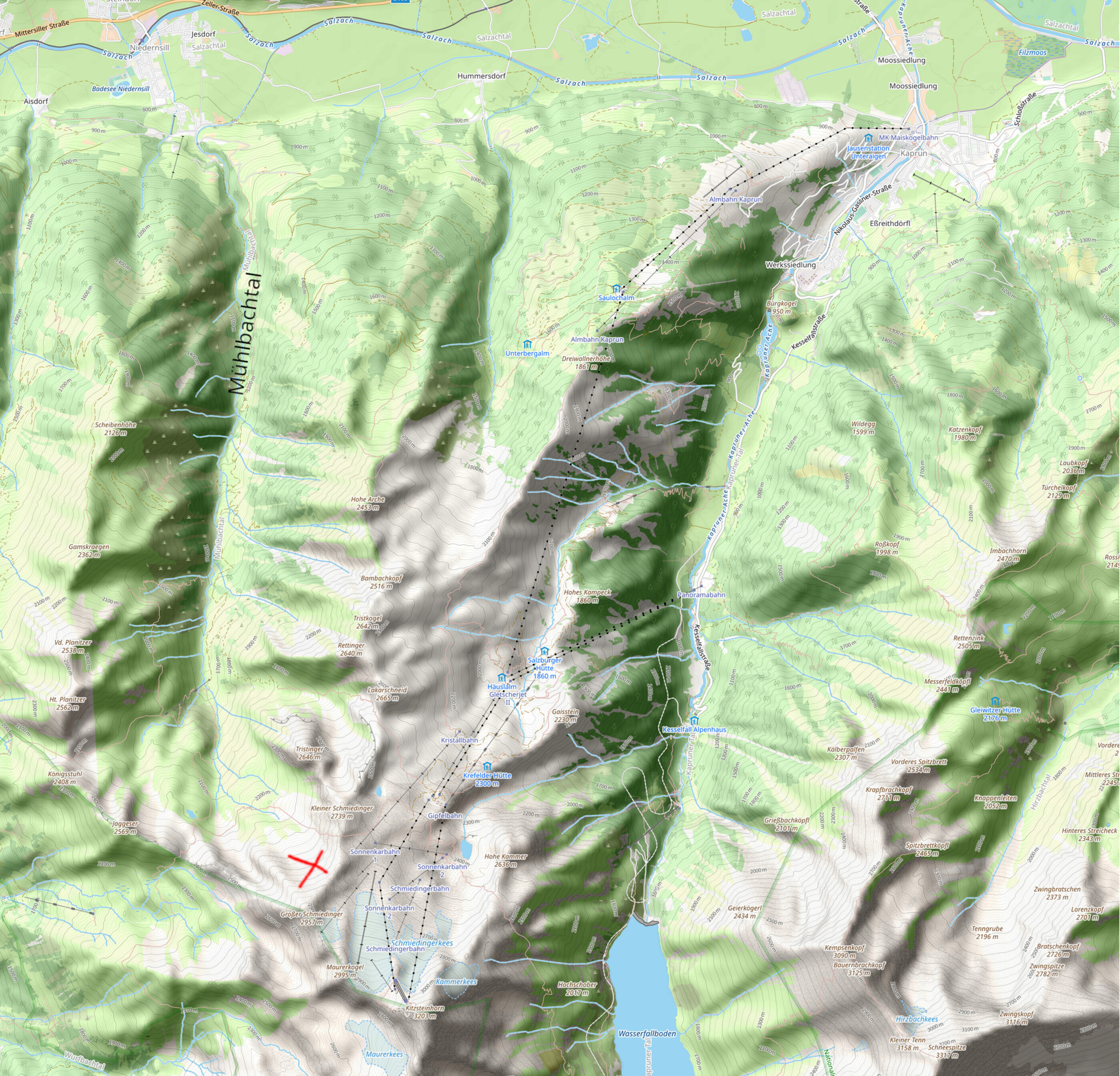 Eine der möglichen Varianten hinab ist die Traverse hinüber ins Mühlbachtal runter nach Niedernsill. Regelmäßig ist von der Bergstation der Kristallbahn eine Spur hinauf in die Schmiedingerscharte zwischen Kleinem und Großem Schmiedinger eine pistenraupenspurbreit gewalzt. Es ist nicht all zu weit und immer wieder gehen da auch Leute für die Aussicht hoch. Von dort aus könnte man in das Mühlbachtal abfahren über die öfter mal "Großer Hang" genannte Variante, die ich auf der Karte mit dem roten X markiert habe. Genau dort ereignete sich im Jahr 2000 bei lediglich Lawinenwarnstufe 2 ein schweres Unglück mit 12 Toten Skilehrern während einer Fortbildung. https://www.spiegel.de/panorama/oesterr ... 70918.html. Heute sind die Verhältnisse durch den Neuschnee und die Windverfrachtungen bei LWS 3 deutlich diffiziler - der "Große Hang" ist daher nicht unser Weg und wir gelangen anders ins Mühlbachtal. Wie, das beschreibe ich hier bewusst nicht - aber man muss auch dafür aufsteigen und das durch Gelände, in dem es heute bisher keine Spur gibt. Das ist der Moment für einen aus der Gruppe, der in seinem Spitznamen unter anderem "Spurentreter" trägt. Nicht ohne Grund, denn er, der die Spur in den Tiefschnee stampft, legt dabei ein Tempo vor, dass ich in seiner Spur so gerade mitkomme und der Rest der Gruppe leicht zurück fällt.