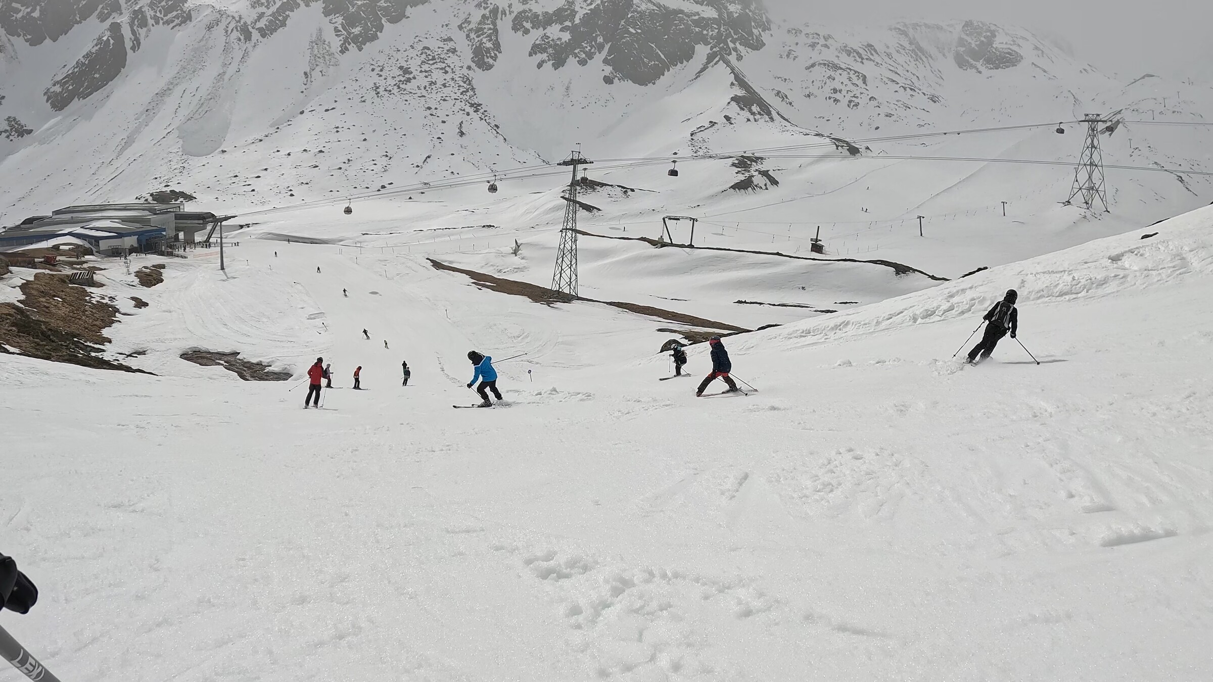 On Wednesday 16.4. it was very windy. Open only Eisgratbahn and part of blue 1 and blue 3 and 4 slopes.
