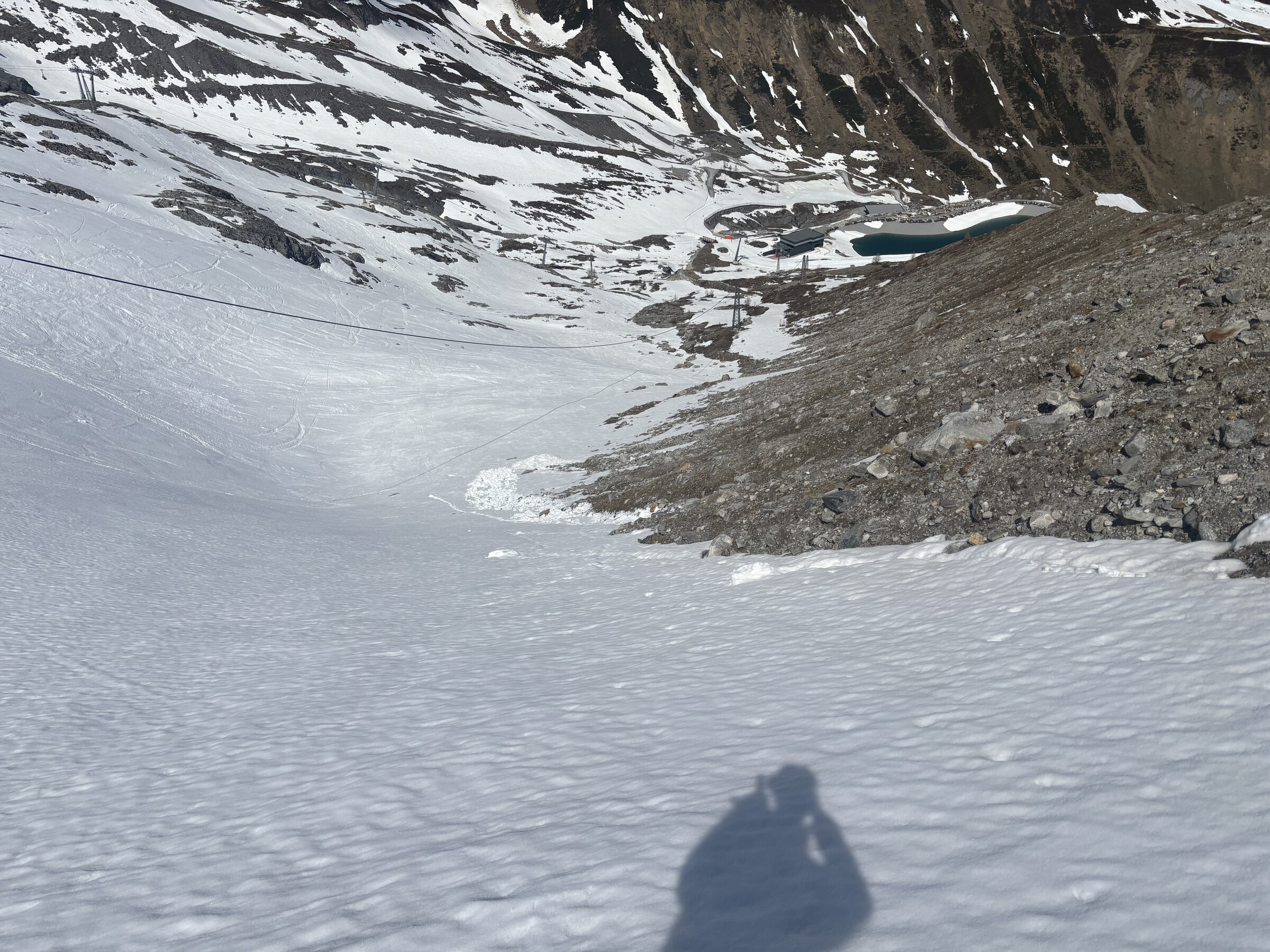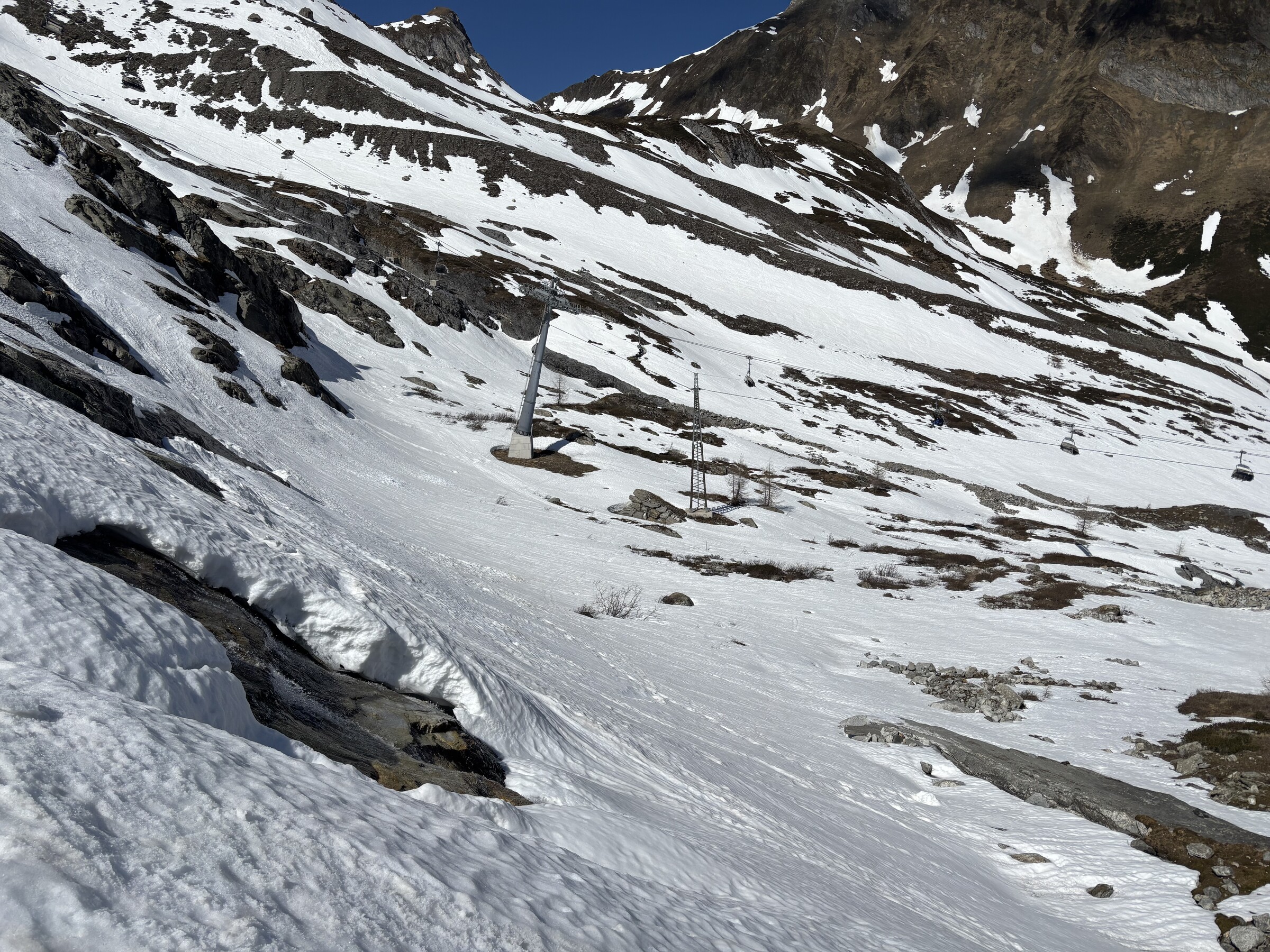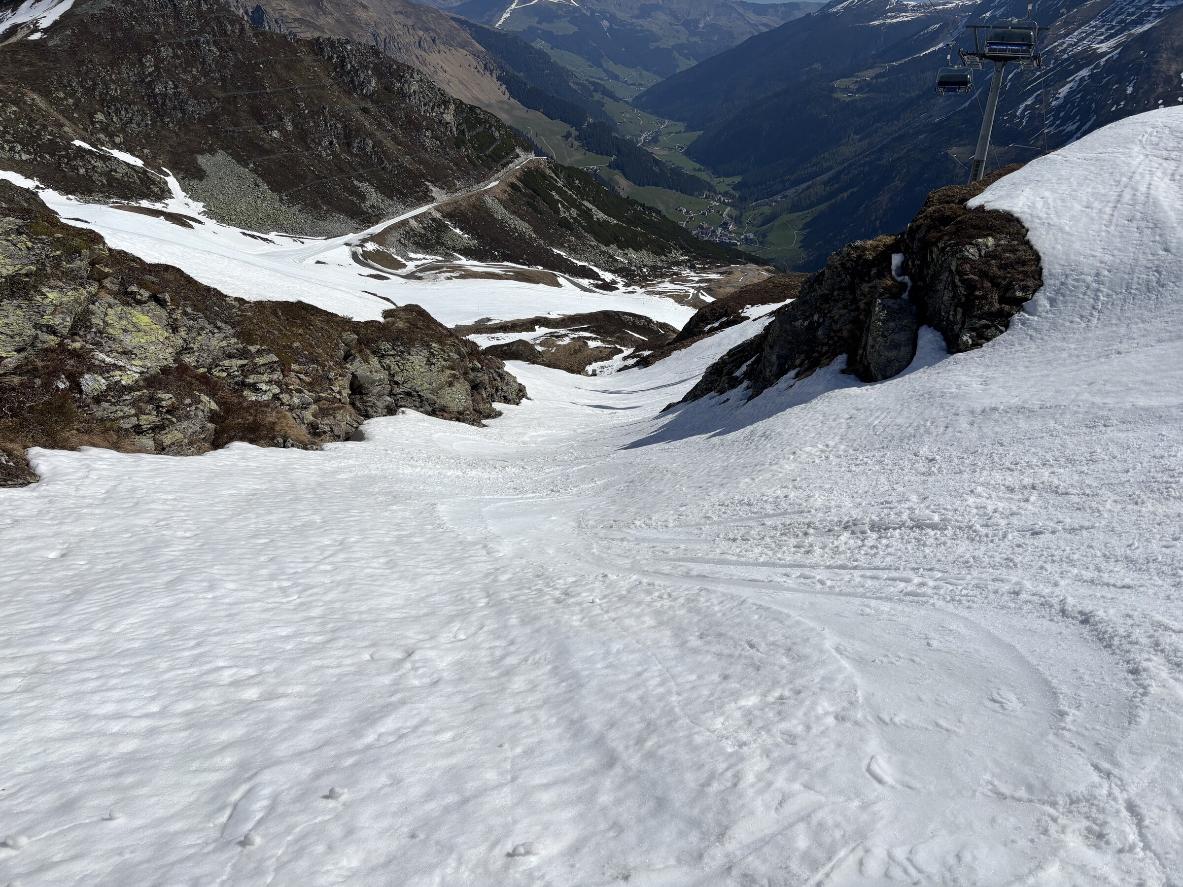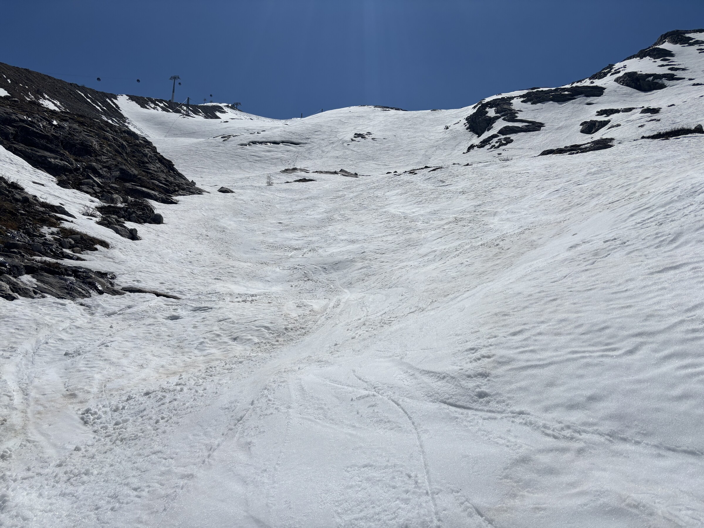 Darunter, also nach der Stromleitungsrinne, leider nicht wie im Vorjahr Sommerschnee sondern nur ein Vorstadium mit bereits staubiger und wabenartiger Beschaffenheit, aber leider sehr weich ohne tragenden Deckel. Jedoch auch kein kompletter Sumpf und durch konsequentes Verwenden der gleichen Spur sogar bald ganz okay wenn auch recht anstrengend. Etwas war auf durchkommende Steine und den darunterliegenden Bach zu achten. Und oben zunächst ein Stück auf der mässig spannenden Piste mit nicht ganz ungefährlicher Kreuzung.