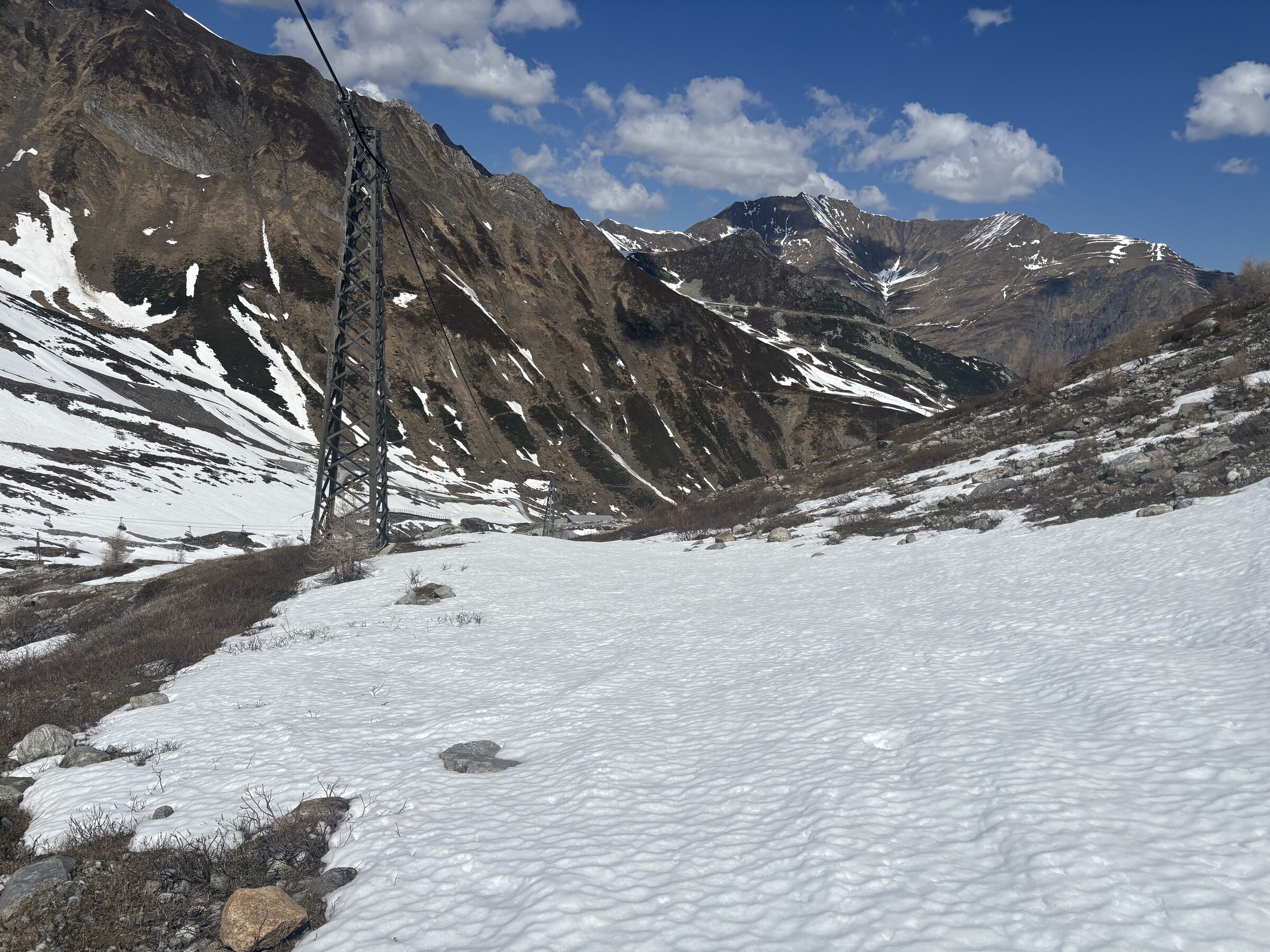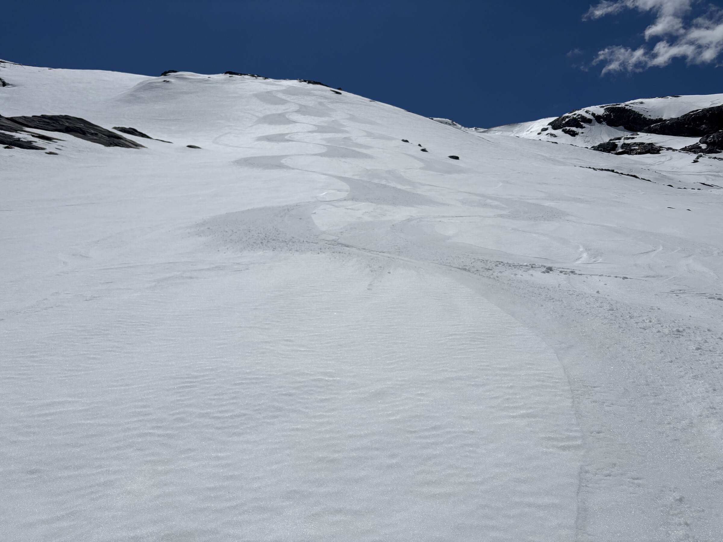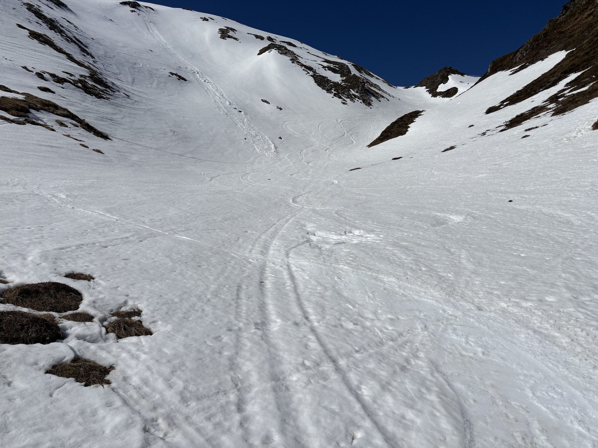 Darunter, also nach der Stromleitungsrinne, leider nicht wie im Vorjahr Sommerschnee sondern nur ein Vorstadium mit bereits staubiger und wabenartiger Beschaffenheit, aber leider sehr weich ohne tragenden Deckel. Jedoch auch kein kompletter Sumpf und durch konsequentes Verwenden der gleichen Spur sogar bald ganz okay wenn auch recht anstrengend. Etwas war auf durchkommende Steine und den darunterliegenden Bach zu achten. Und oben zunächst ein Stück auf der mässig spannenden Piste mit nicht ganz ungefährlicher Kreuzung.