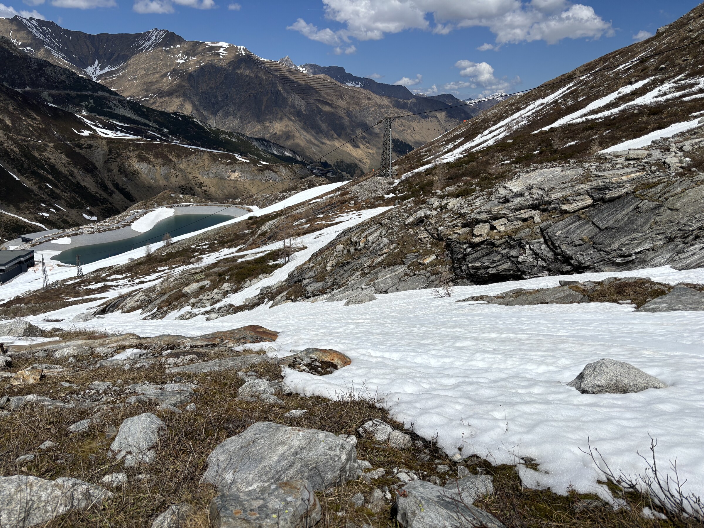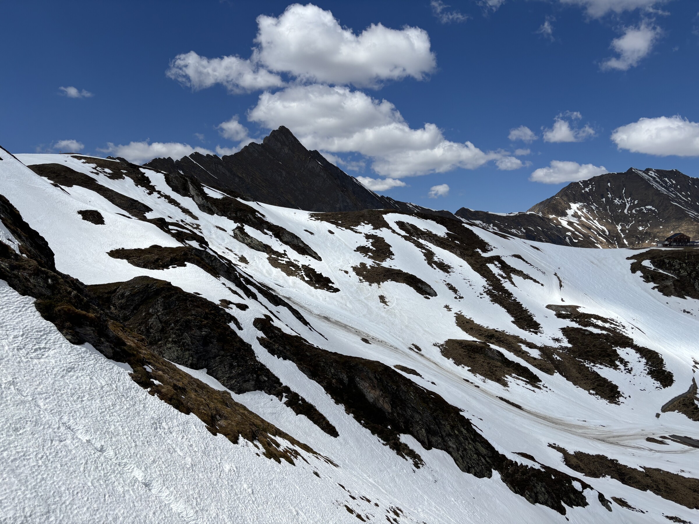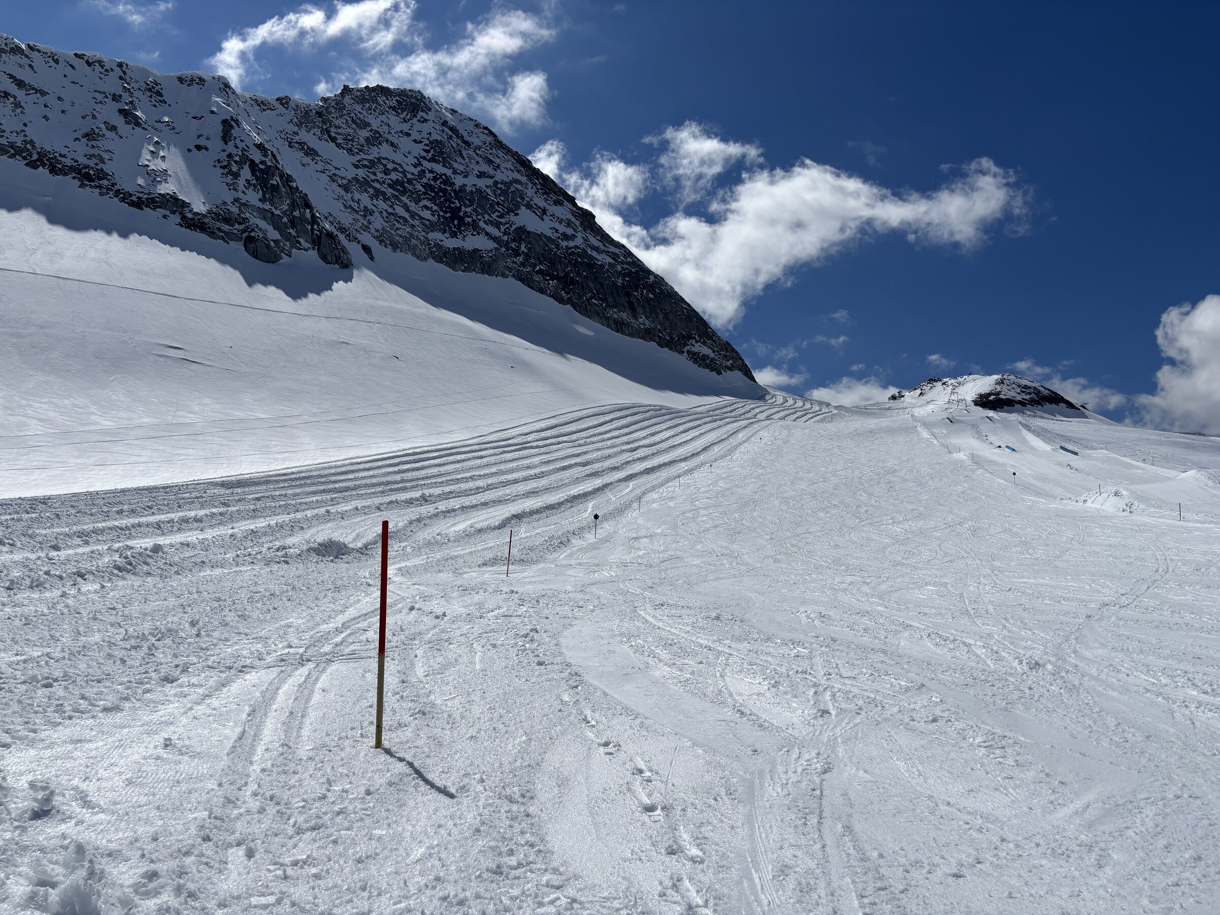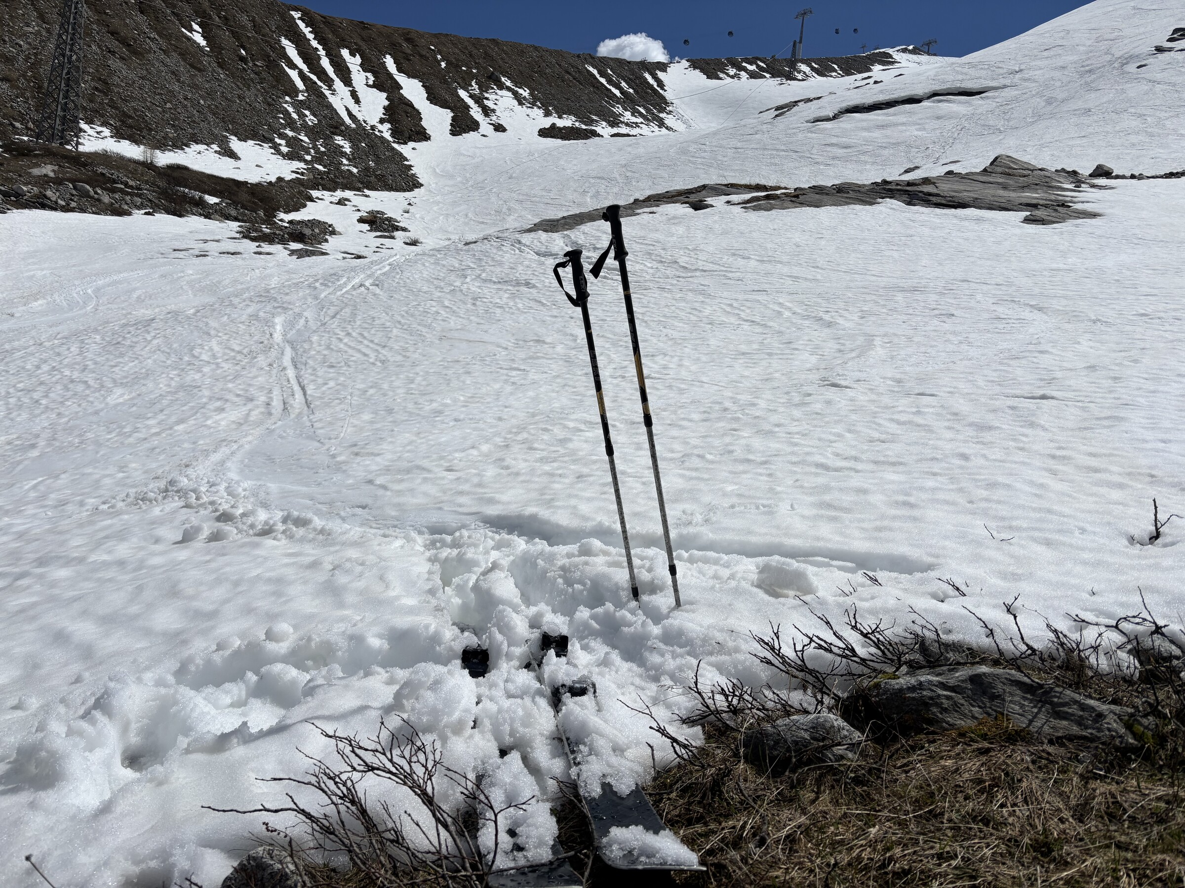 Darunter, also nach der Stromleitungsrinne, leider nicht wie im Vorjahr Sommerschnee sondern nur ein Vorstadium mit bereits staubiger und wabenartiger Beschaffenheit, aber leider sehr weich ohne tragenden Deckel. Jedoch auch kein kompletter Sumpf und durch konsequentes Verwenden der gleichen Spur sogar bald ganz okay wenn auch recht anstrengend. Etwas war auf durchkommende Steine und den darunterliegenden Bach zu achten. Und oben zunächst ein Stück auf der mässig spannenden Piste mit nicht ganz ungefährlicher Kreuzung.