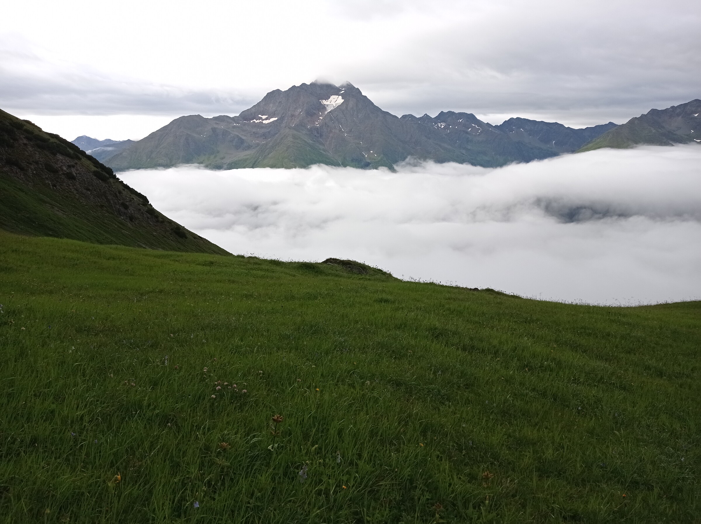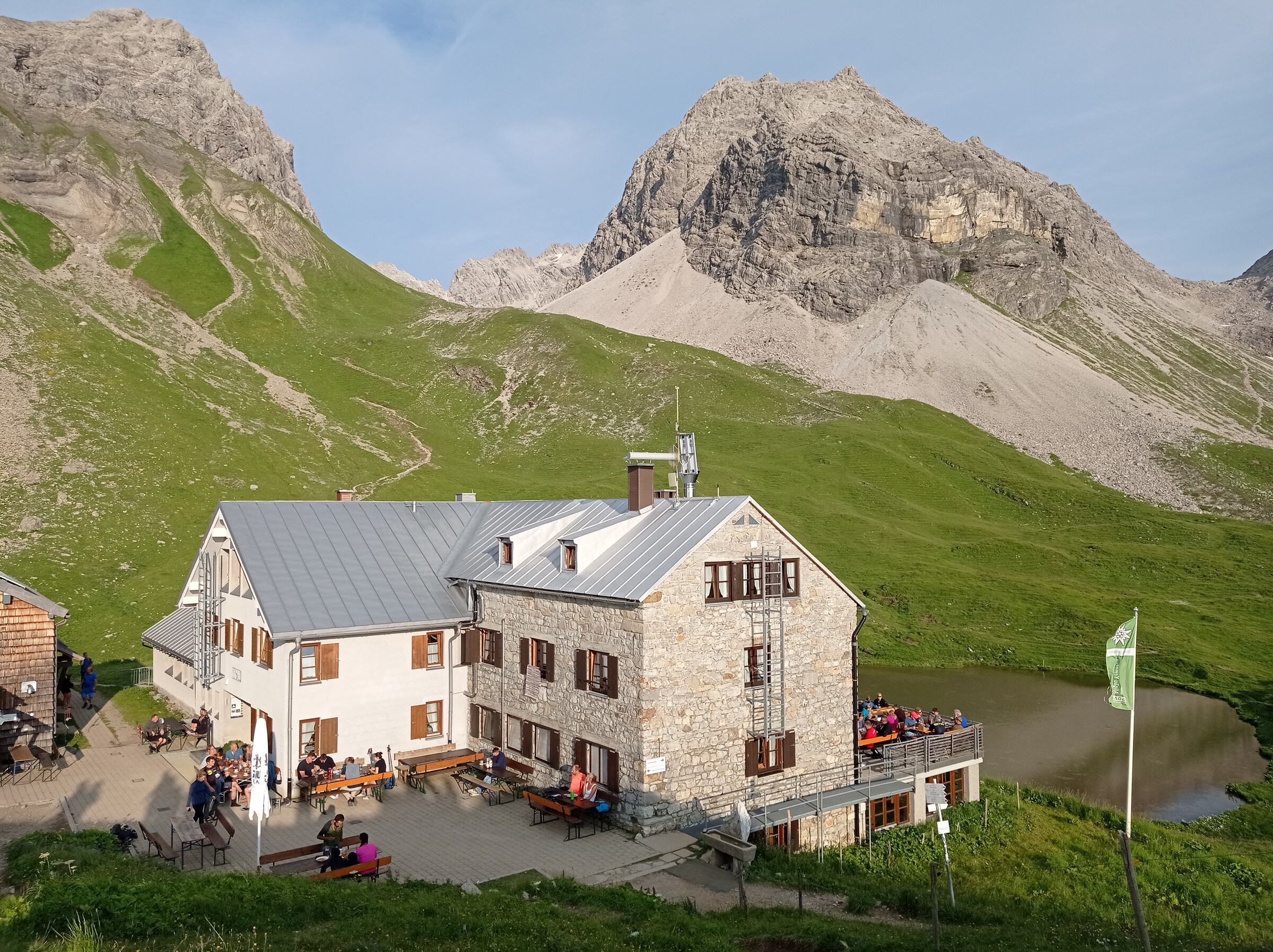 Morgendlicher Blick vor der Hütte. Immerhin hat der Regen aufgehört. Unten im Tal hängen die Wolken. Heute geht es zunächst hinab nach Pettneu. Über dem Stanzertal wacht der markante Hohe Riffler (3.168 m). Blick zurück zum Kaiserjochhaus. Schon nach kurzer Zeit kommen wir in die Wolken und es beginnt zu regnen. Nach gut 2 Stunden erreichen wir dann Pettneu am Arlberg, wo wir uns in einem Café etwas aufwärmen. Danach holt uns wieder ein Taxi ab und bringt uns ins Malfontal zur Malfonalm. Hier machen wir erst einmal Mittagspause. Dann geht es weiter ins Malfontal hinein. Wir können heute unsere Rucksäcke mit der Materialseilbahn hochschicken und machen uns mit leichtem Gepäck an den Aufstieg. Auch hier gewinnen wir wieder schnell an Höhe. Meistens bleibt es trocken, aber der Wind pfeift ziemlich kalt. Blick zurück - in der Senke in der Mitte steht das Kaiserjochhaus, wo wir heute morgen gestartet sind. Rückblick ins Malfontal. Schön ruhig und einsam ist es hier. Hoffentlich bleibt es auch so - eine Ski-Erschließung brauche ich hier nicht. Schließlich taucht auch unser Tagesziel auf. Die Edmund-Graf-Hütte. Dank leichtem Gepäck haben wir nur rd. 1,5 Stunden von der MSB aus gebraucht. Außer uns sind nicht viele Gäste da und wir haben wieder einen schönen Hüttenabend mit einem sehr netten jungen Hüttenwirt. Tag 4: Mittwoch, 26.07.2023