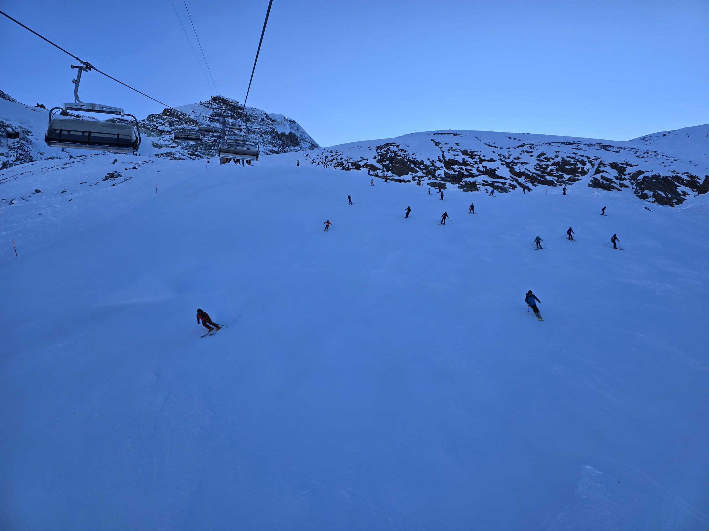 Auf den oberen Gletscherliften dann kein Andrang. Grund dürfte die bittere Kälte sein, irgendwo zwischen -15 und -20. Sogar die Skis rutschen schlecht.
