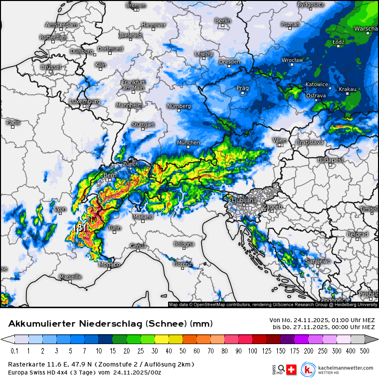 Schnee wird es alpenweit geben, die größten Mengen werden aber in Frankreich prognostiziert mit um die 180 cm, ansonsten verbreitet um die 30 - 40 cm oder generell im Westen mehr, im Osten weniger: Akk. Schneemenge bis Do. 27.11. 0 Uhr