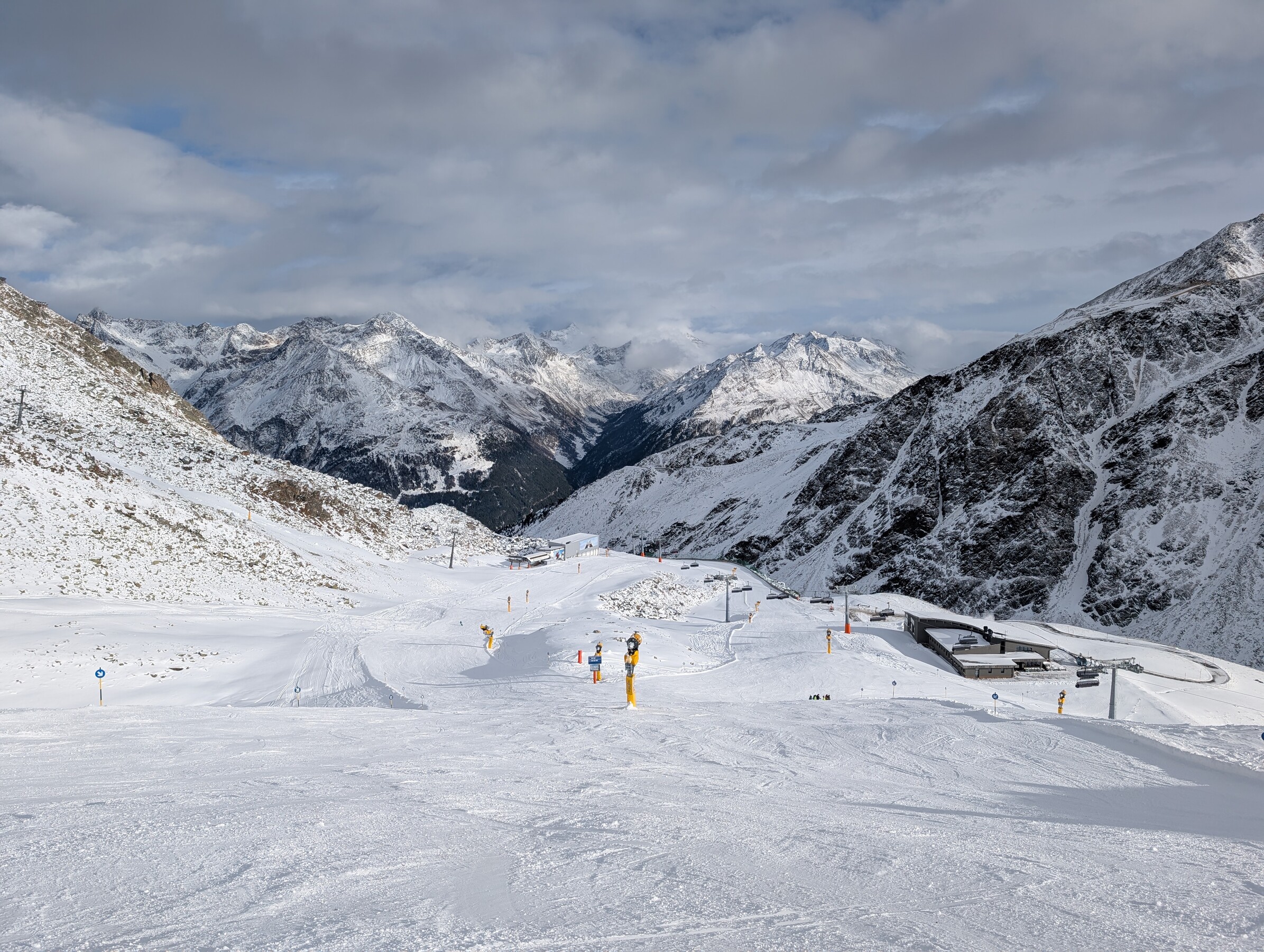 Bzgl. weiterer Öffnungen: Am Hainbachkar wurde gearbeitet, da fehlt im Mittelteil noch etwas Schnee. 2 bis 3 kalte Nächte könnten da aber ausreichen. Gletscherabfahrt zum Langegg wurde schonmal grundpräpariert, aus der Ferne würde ich sagen: könnte demnächst aufgehen, kann aber aus der Ferne natürlich auch täuschen. Langegg 6er lief heute auch schon zeitweise im Testbetrieb. Die Hauptabfahrt zum Langegg benötigt dagegen noch einiges an Schnee.