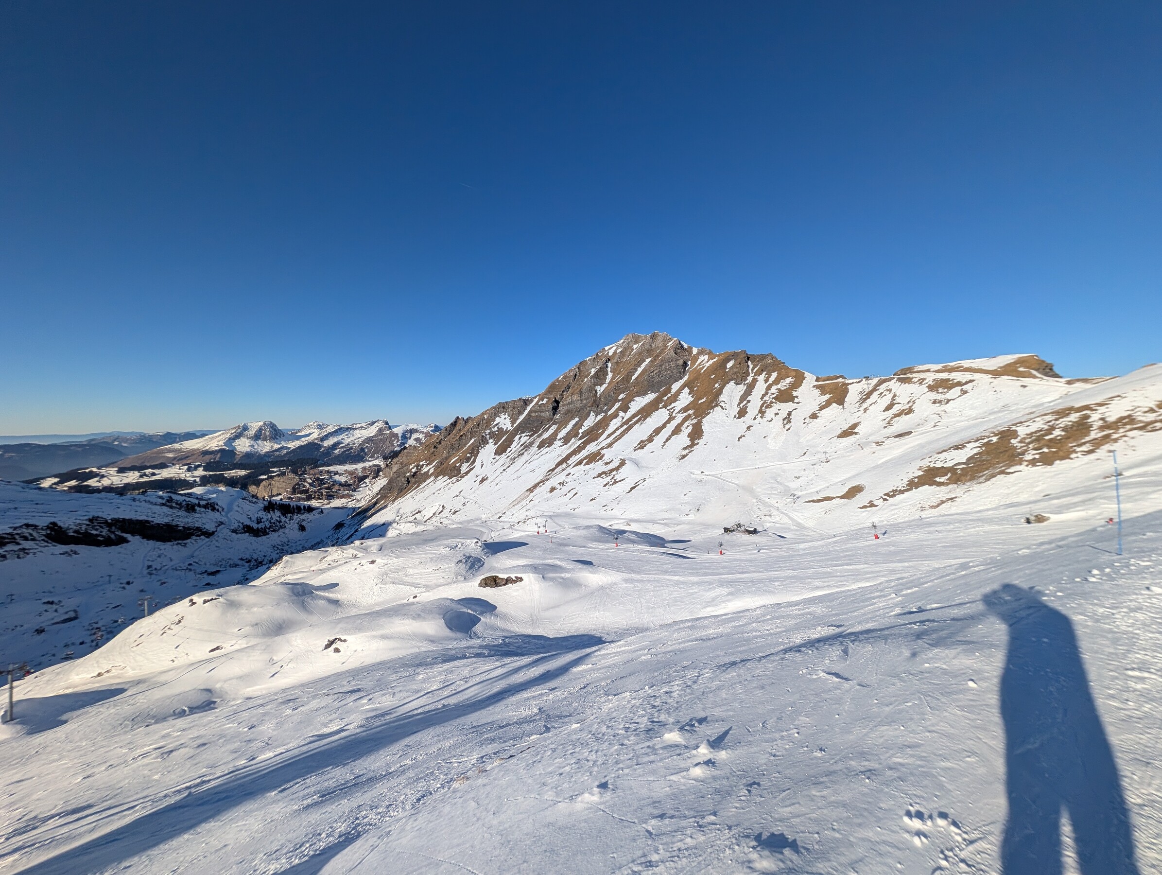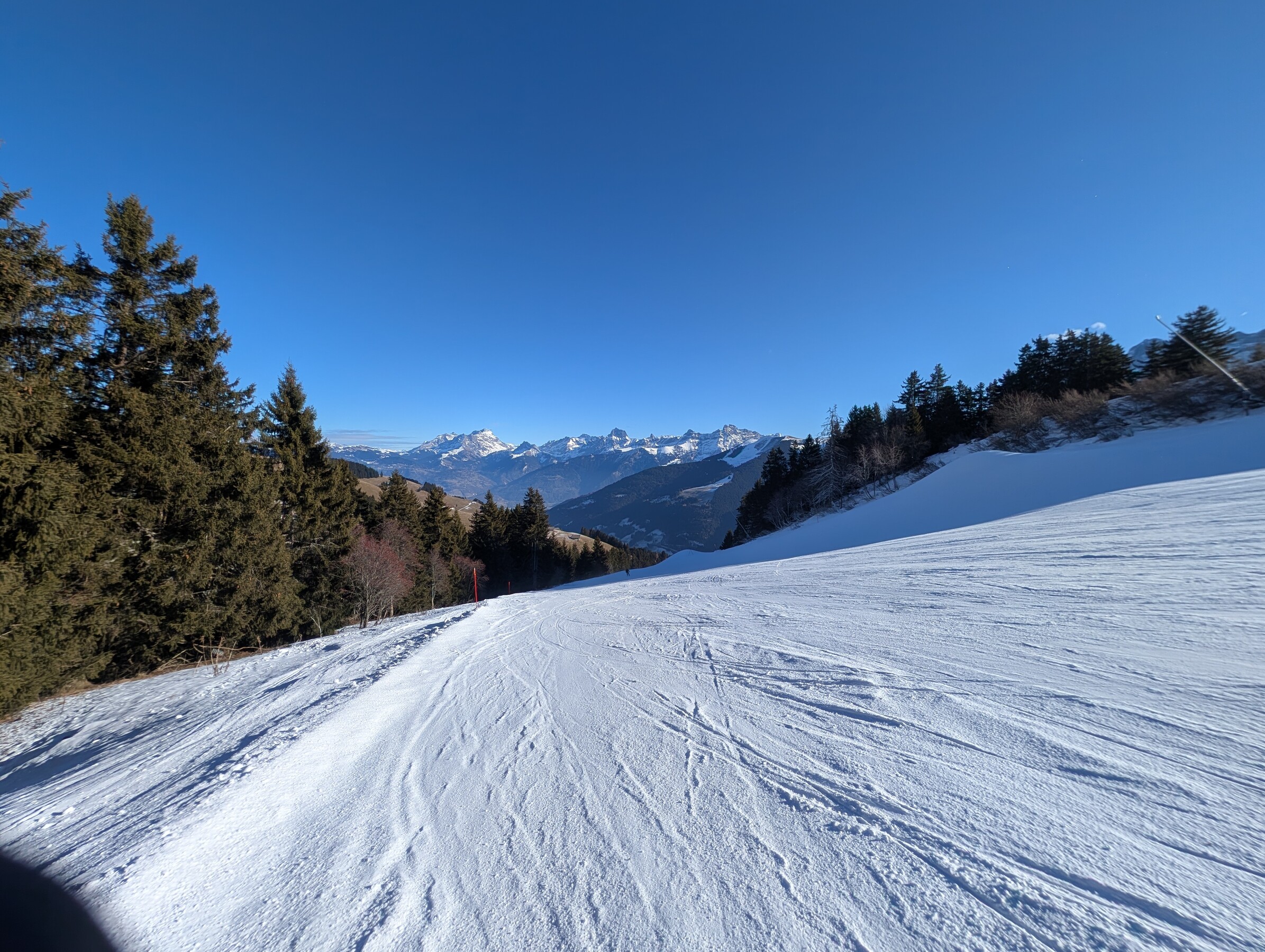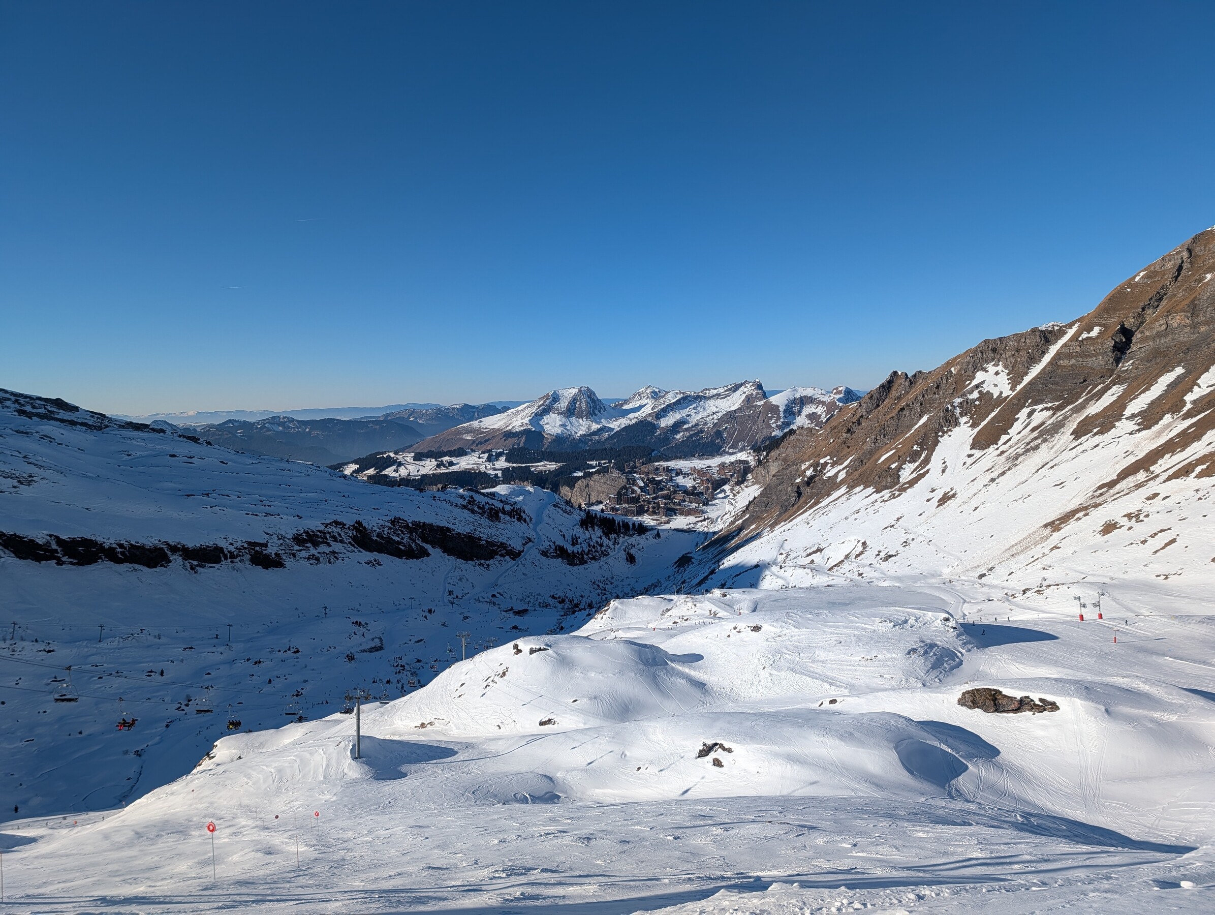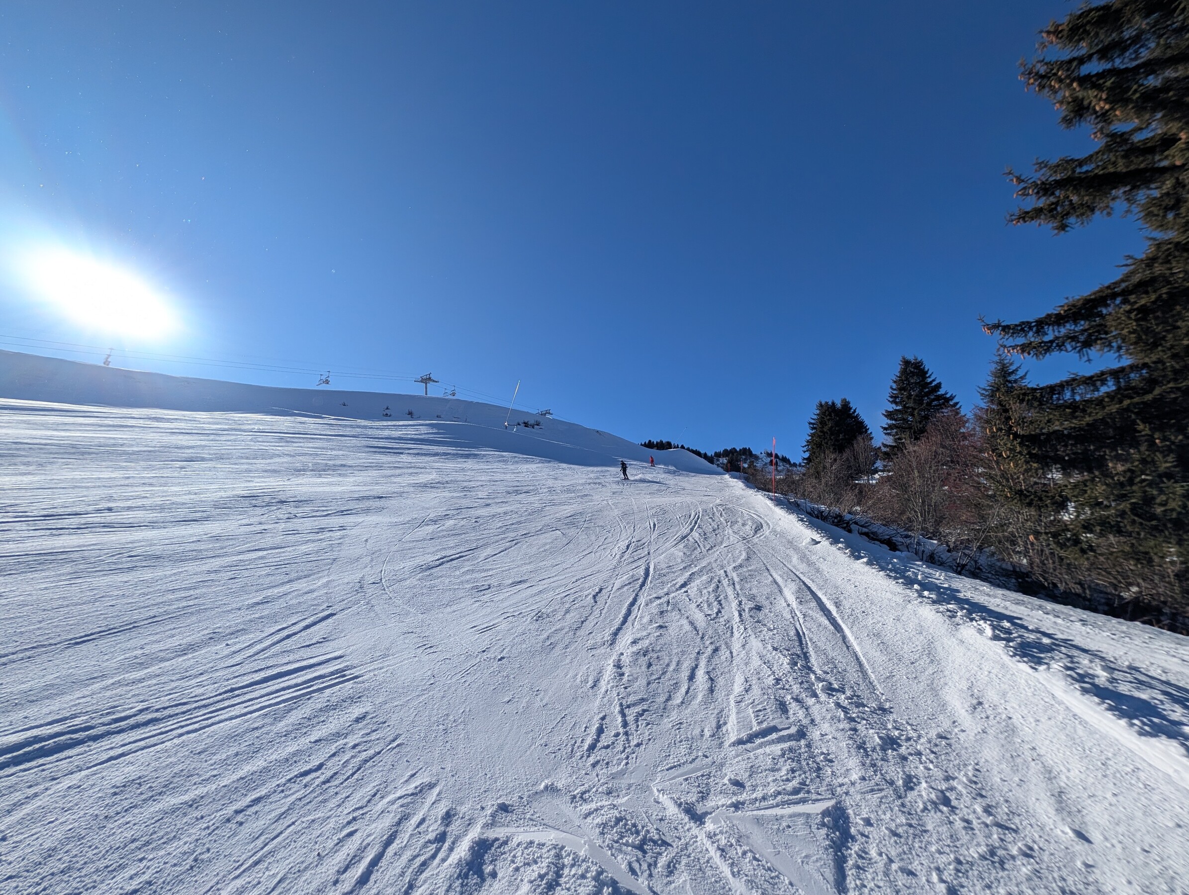Auf Schweizer Seite deutlich weniger los. Erstaunlich gut mit Kunstschnee erhalten. Schöne runde von Avoriaz Uber morzine