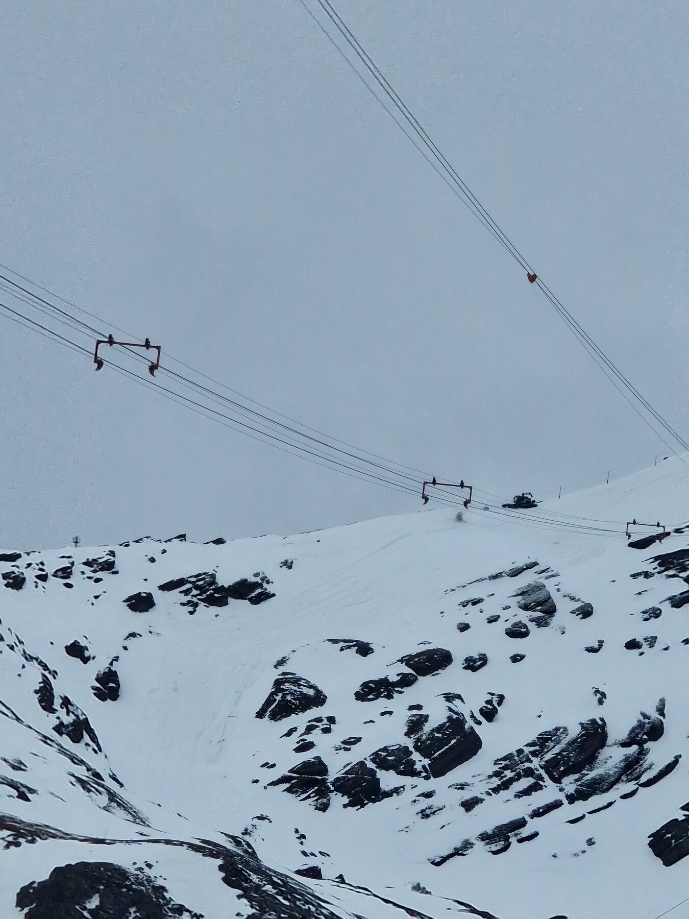 Recht gut schaut es vorallem am Gipfel aus. Ein Leitwolf ist hier am arbeiten und die Piste ist auch, soweit ersichtlich, bereits grundpräpariert. Hier lief fast zuoberst auch eine Schneekanone. Bisher dachte ich immer dass diese Piste unbeschneit ist.