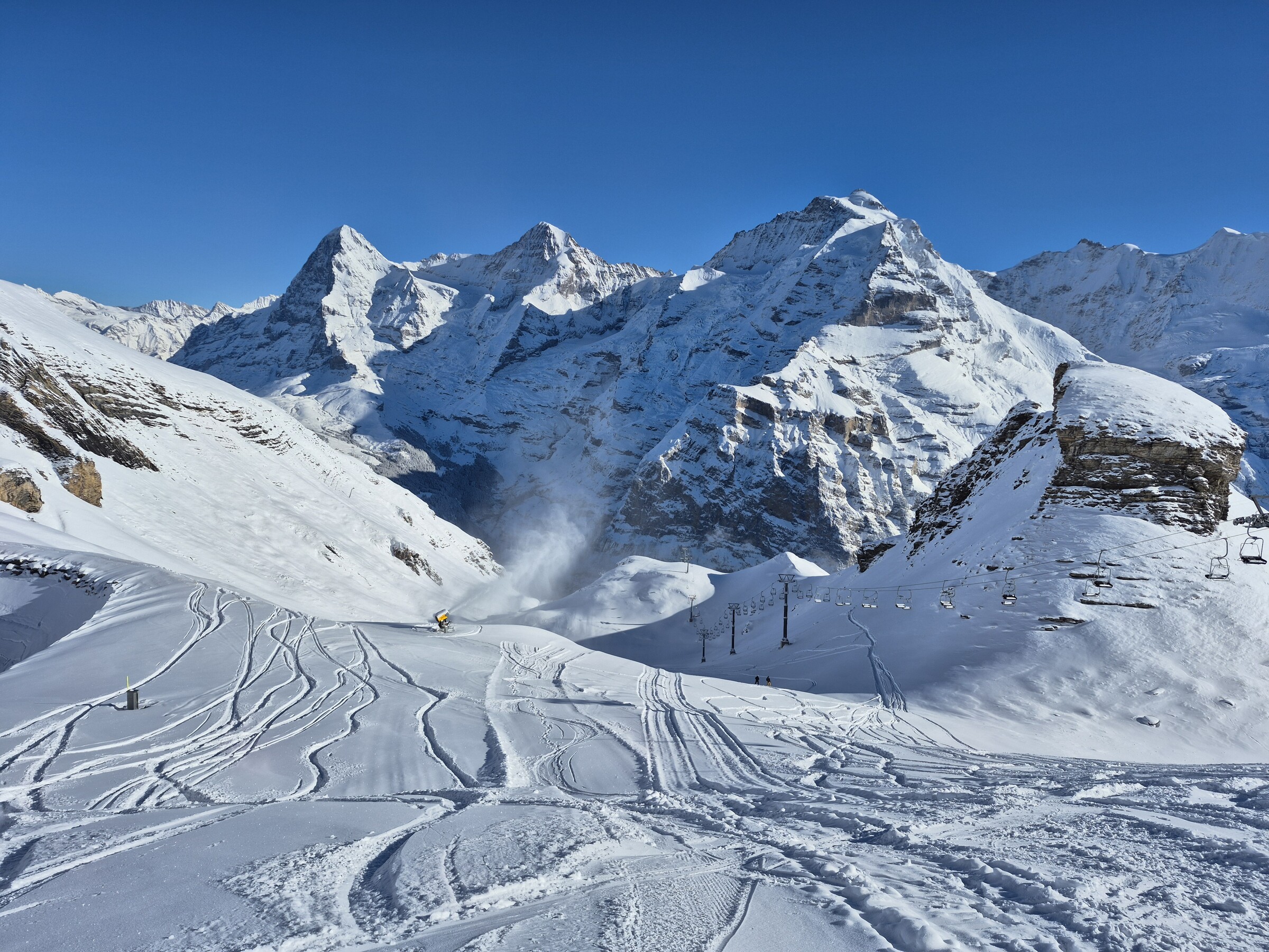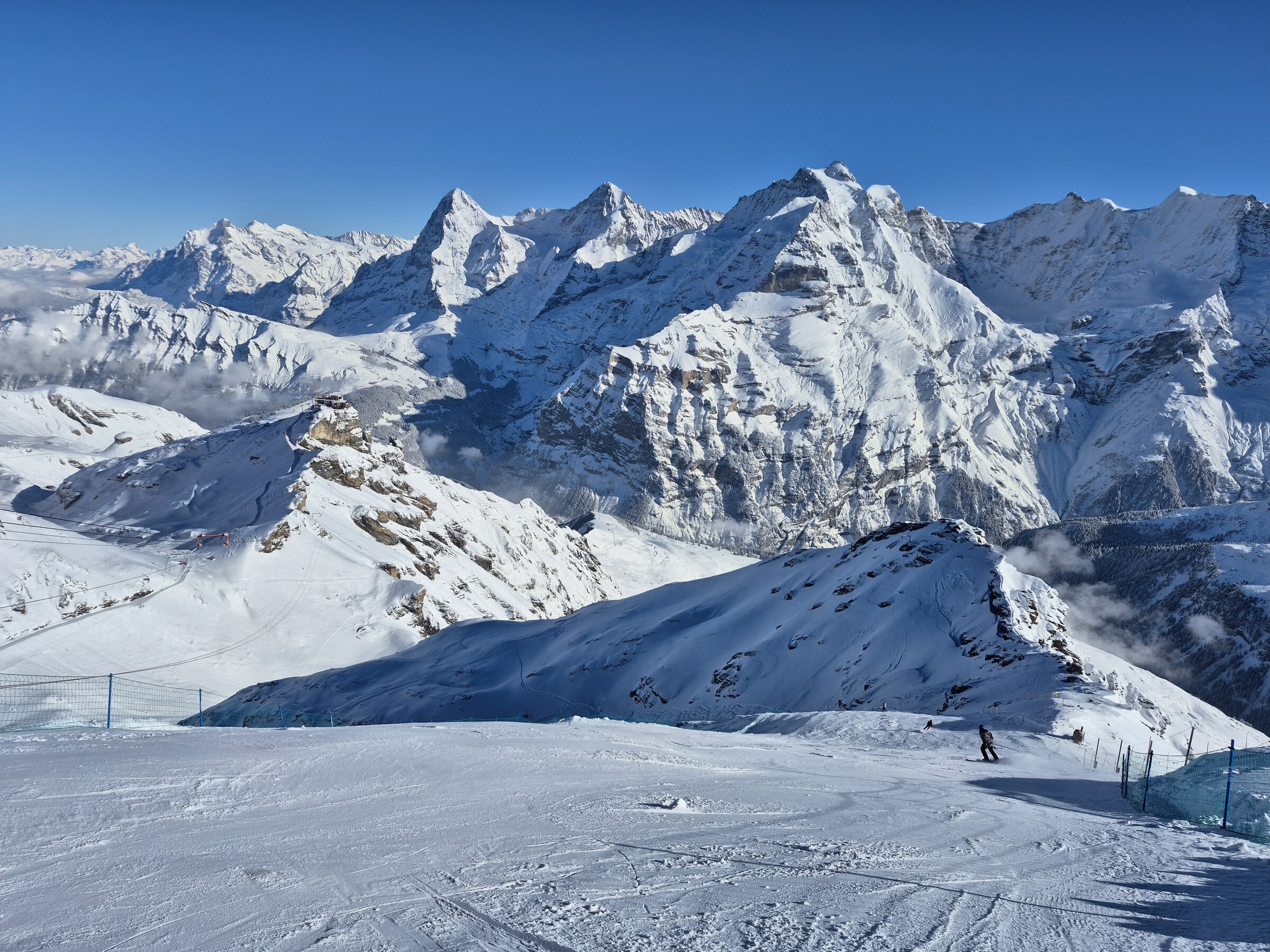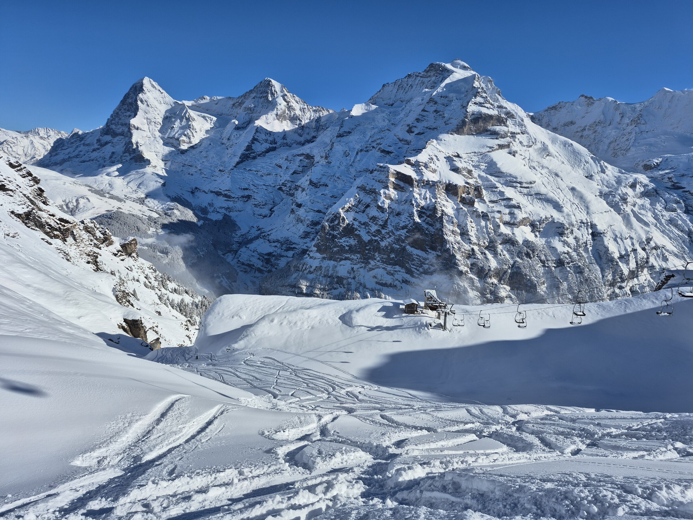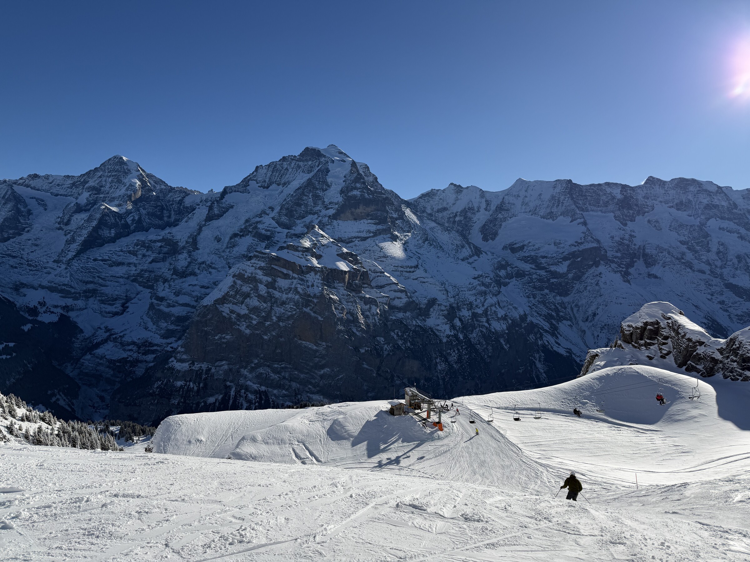 Heute gab es ziemlich Andrang in Mürren. Da hier aktuell von Stechelberg eine Pendelbahn mit 2 Spuren + die ÖV Gäste via Grütschalp auf die einspurige Funifor Mürren-Birg treffen, ist dies das Nadelöhr. Leider hatte die Sektion Birg-Schilthorn bis kurz vor Mittag technische Probleme. Erst als ein Ersatzteil per Heli eingeflogen wurde, konnte auch diese Bahn in Betrieb genommen werden. Relative lange Wartezeiten (10-15 Minuten) gab es an der KSB Riggli. Am 2er Sessel Muttleren musste selten mehr als 2-3 Sessel gewartet werden.