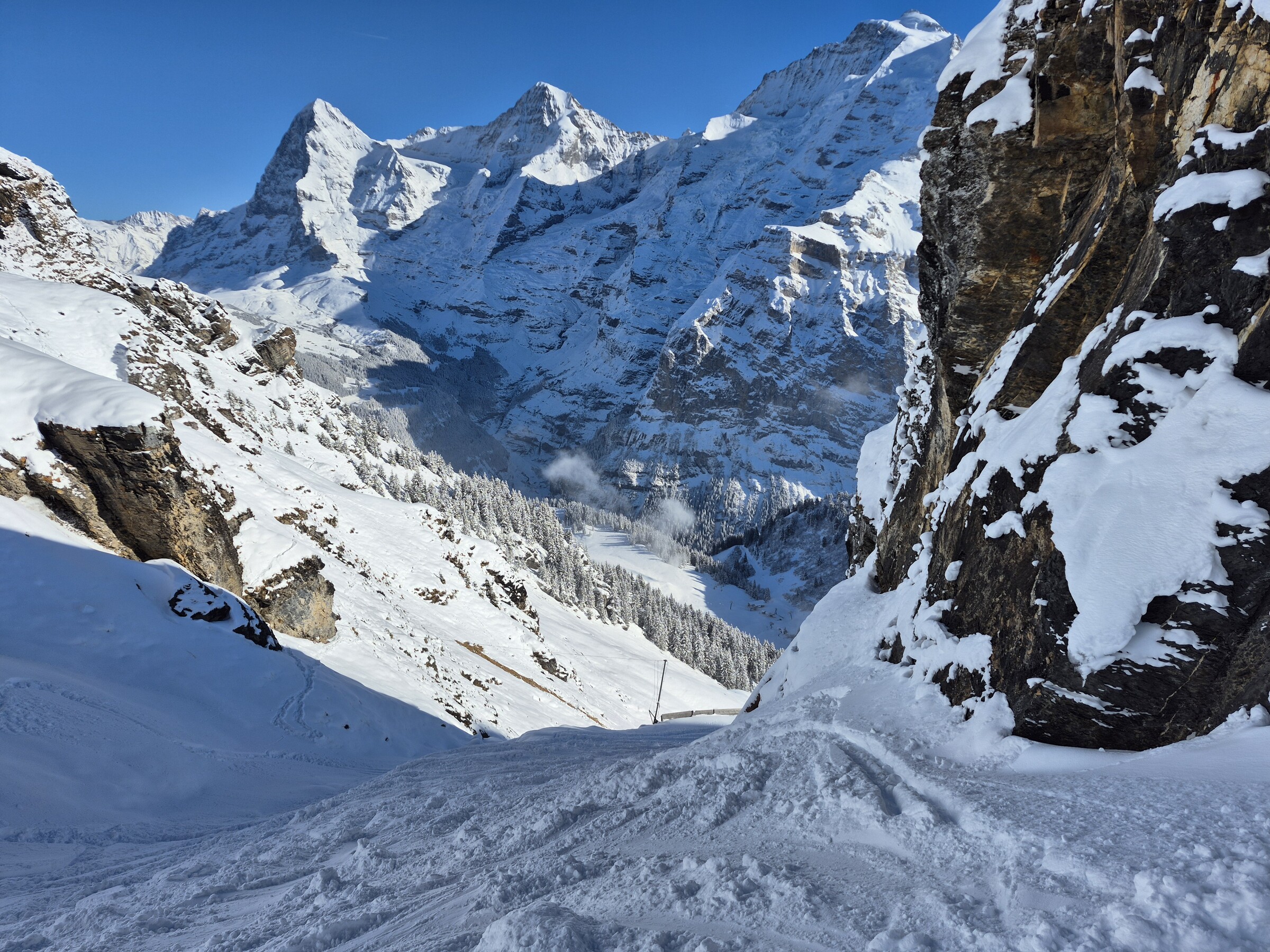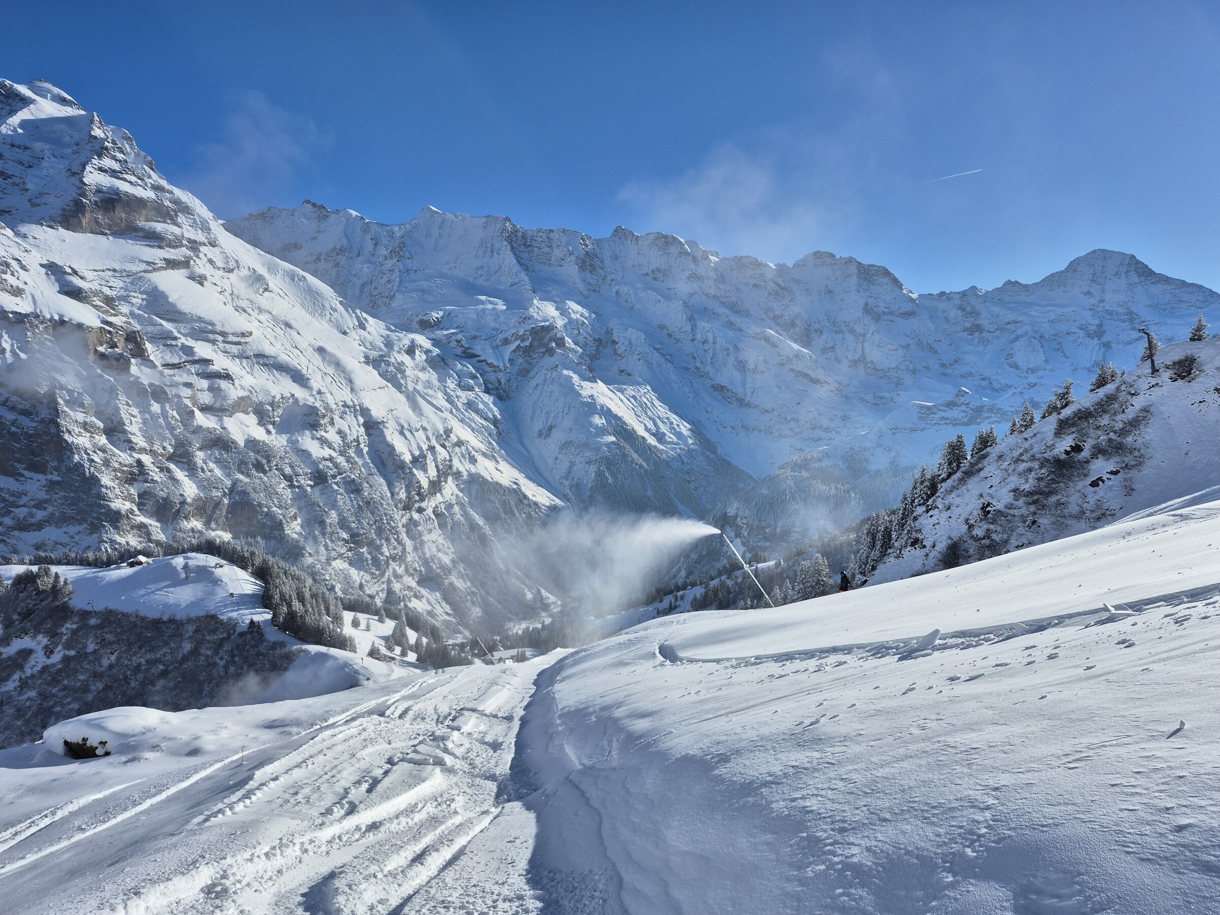 Die Abfahrt nach Mürren ist noch geschlossen, aber gut fahrbahr. Einzig im Kanonenrohr gab es 2 Abschnitte, mit vereisten Pistenfahrzeugspuren. Neben der Piste ist der Schnee super pulvrig gewesen.