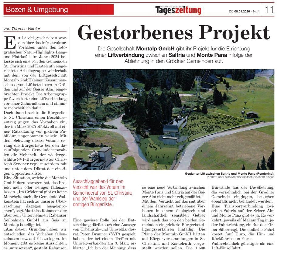 Quelle: Gestorbenes ProjektDie Gesellschaft Montalp GmbH gibt ihr Projekt für die Errichtung einer Liftverbindung zwischen Saltria und Monte Pana infolge der Ablehnung in den Grödner Gemeinden auf.