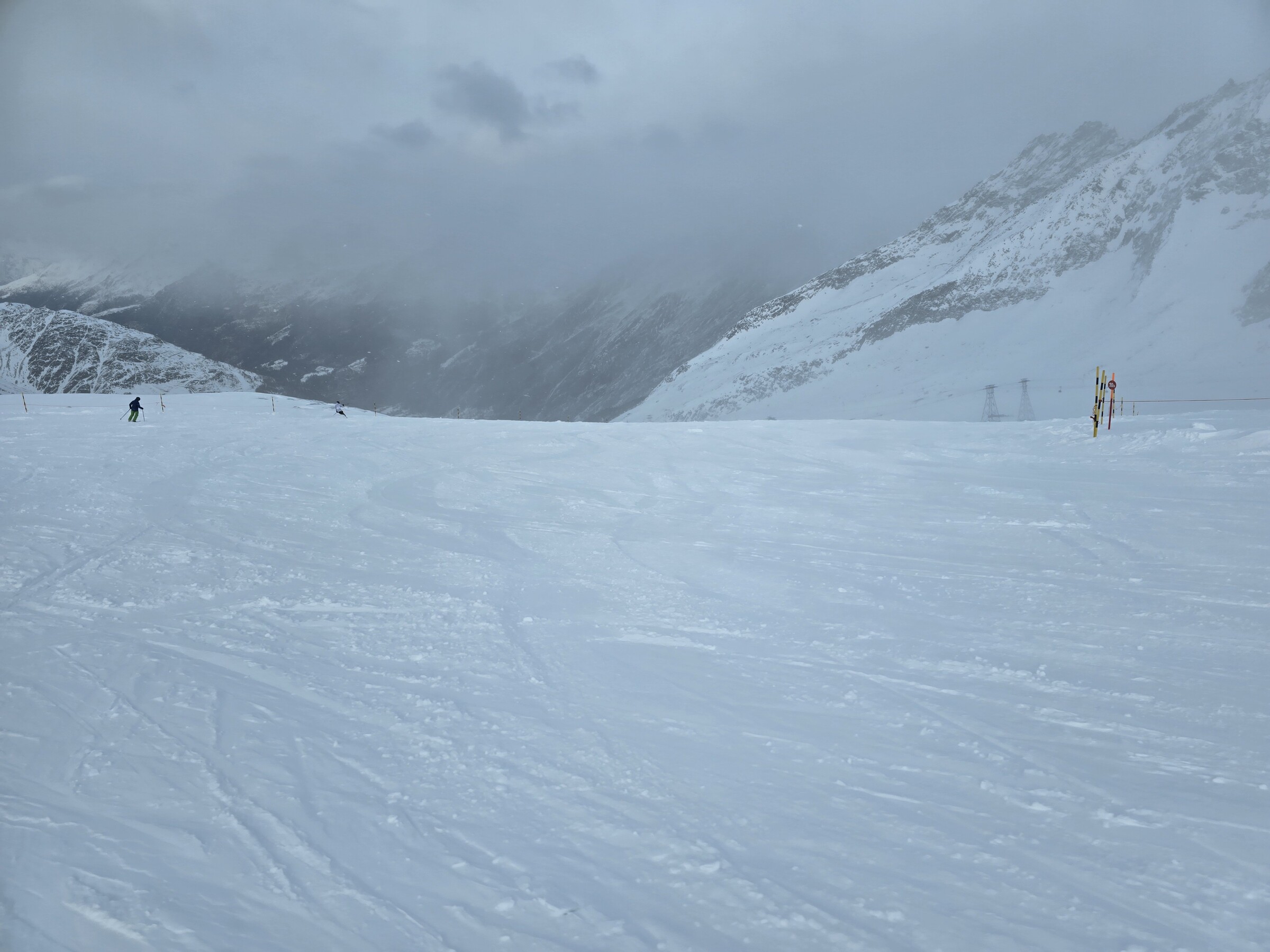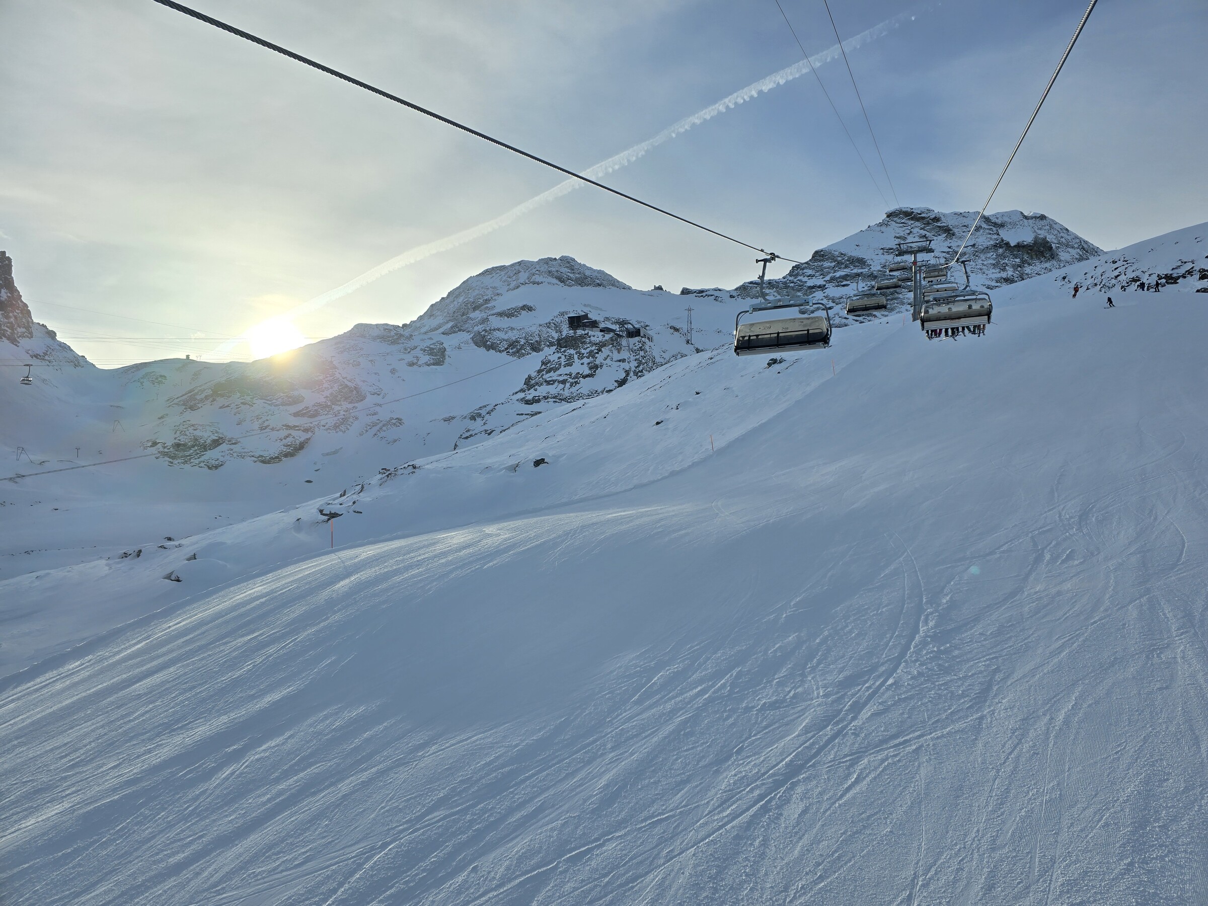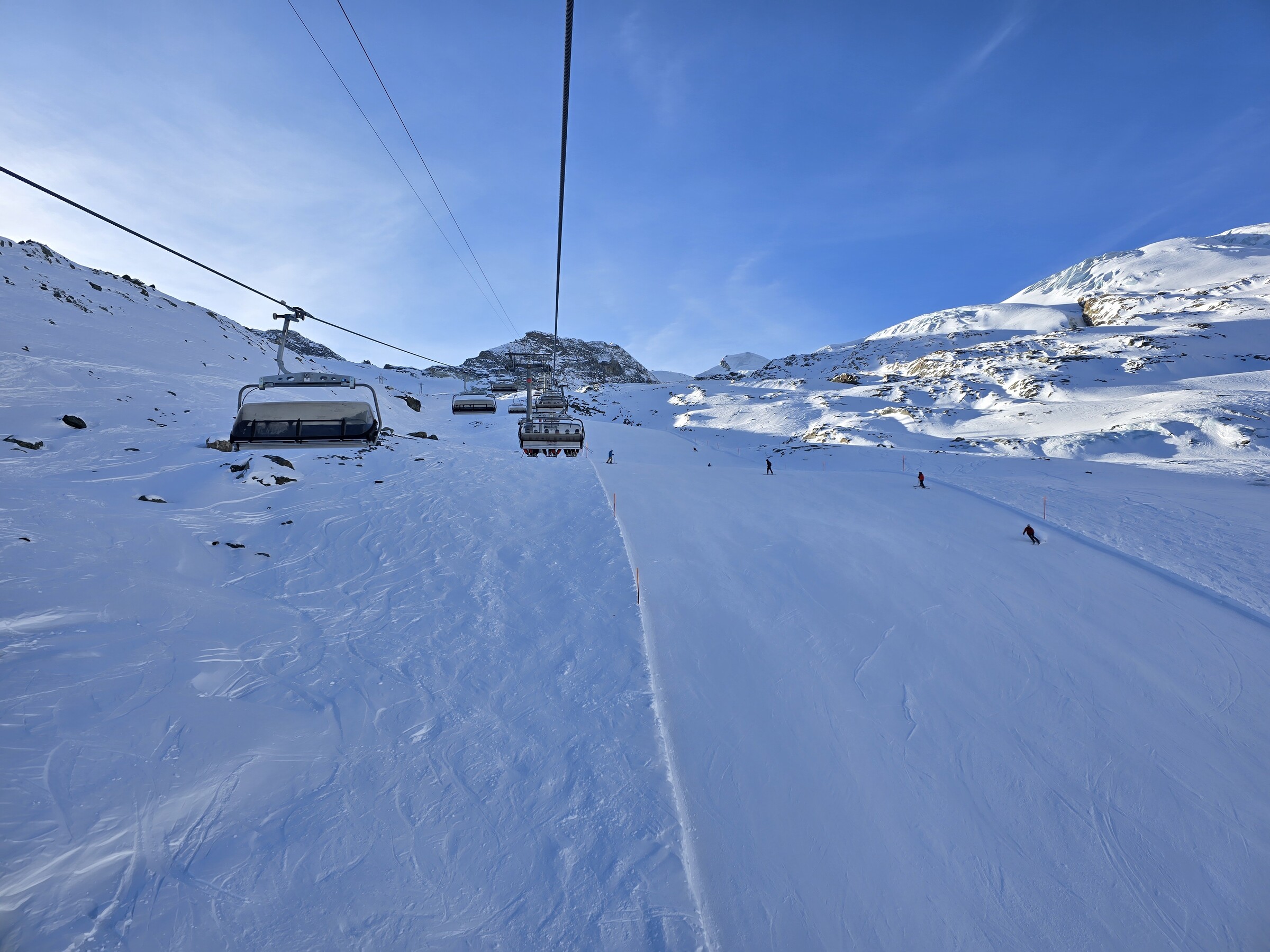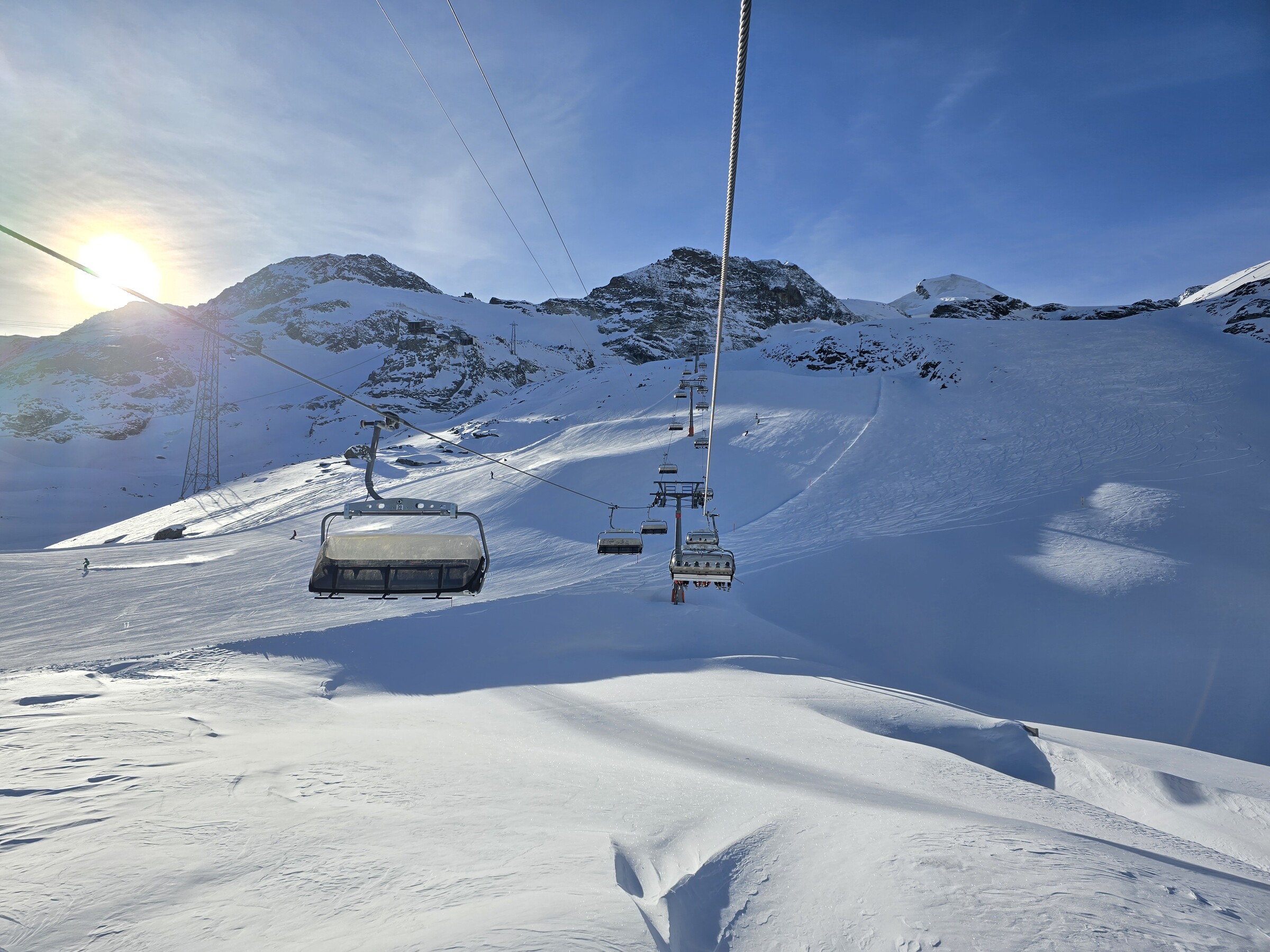 Auf den oberen Gletscherliften dann kein Andrang. Grund dürfte die bittere Kälte sein, irgendwo zwischen -15 und -20. Sogar die Skis rutschen schlecht.
