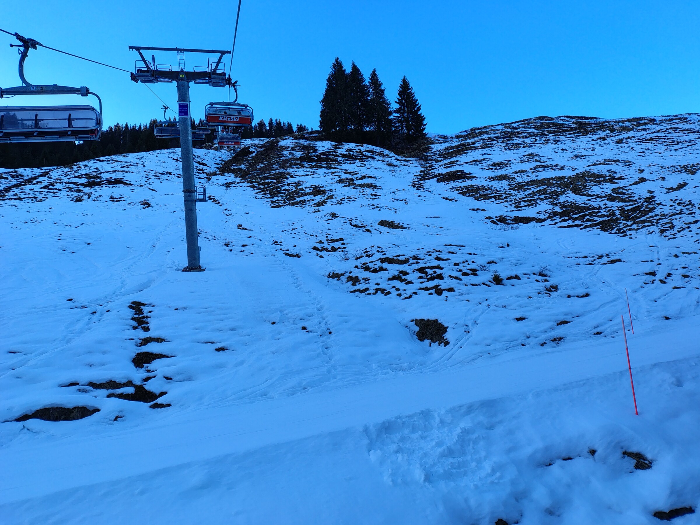 War heute ebenfalls in Kitzbühel und kann die Eindrücke meiner beiden Vorredner bestätigen. Am Vormittag war es durchaus griffig, aber insbesondere am Nachmittag kam großflächig Eis durch. Zu erwähnen sei hier wieder Zweitausender, Bärenbad 1 und die Fleckabfahrt. Äußerst negativ aufgefallen ist die Resterhöhe. Die eine Piste ist für den Europacup gesperrt, im oberen Bereich ist die Piste dadurch recht schmal, da war es bis auf die Wiese abgefahren und dementsprechend steinig (siehe Bild). Steine und Untergrund schauten am Nachmittag auch an der Hanglalm, am Hartkaser und Zweitausender raus. Pengelstein 1 über Brunn, wie @kaldini geschrieben hat, sehr eisig. Ich fand es im Gegensatz zu @Skiwelt07 schon recht voll heute. Wir haben um 15 Uhr am Talsen 10 min gewartet. Gauxjoch lief trotz Wartezeit von 5 min nur mit 4 m/s. Vom Gefühl ist die Schneeauflage in Kitzbühel insgesamt auf den Pisten deutlich geringer als in der SkiWelt und in Saalbach.