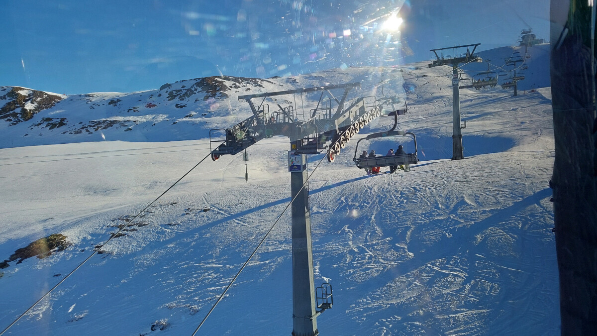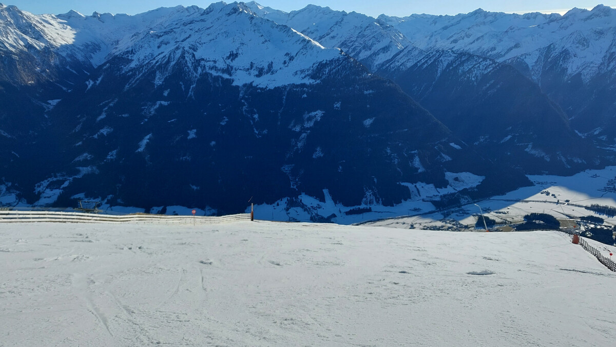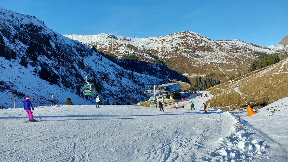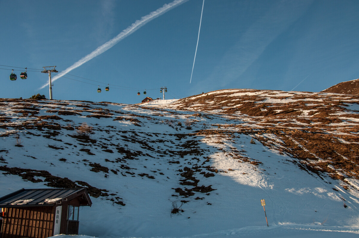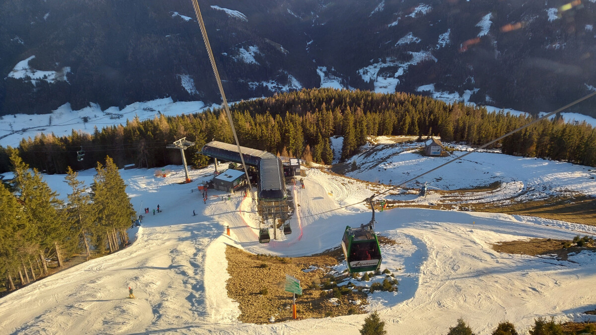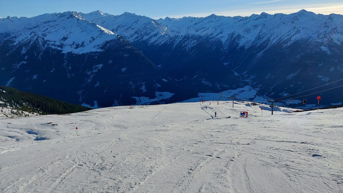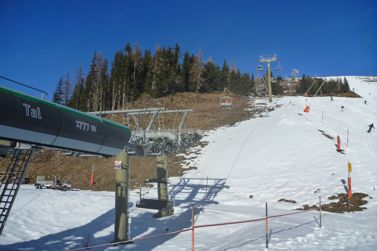 Dank der Kinder in der Gondel checkte ich, dass auch ich aussteigen musste. Zuerst dachte ich, die wollen ab hier rodeln – ich bleib doch eh sitzen und fahre ganz hinauf... bei der Weiterfahrt dann Appetitanreger durch Blick auf die Piste, die ich am Morgen (aber erst mal zum Braunkogellift!) auch drei Mal gefahren bin, als sie noch in sehr gutem Zustand war. Durch die sonnenexponierte Lage weichte alles auf und es bildeten sich Haufen. Erst als die wieder zum Ende hin anzogen, unternahm ich auf jener Prachtstrecke mit bestem Panorama noch ein paar Abfahrten (Bilder hiervon folgen).