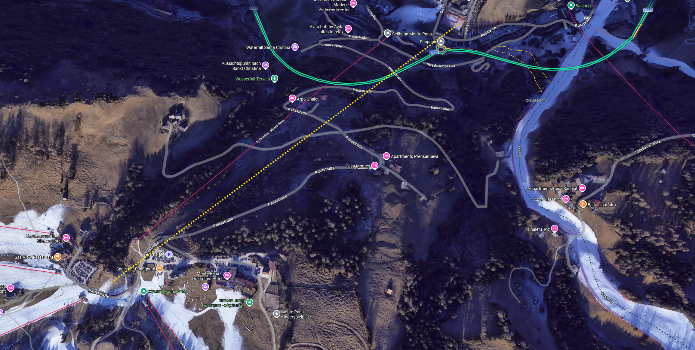 Der jetzt scheint mir der bisher beste Lösungsansatz zu sein, stellt sich aber die Frage, ob man die Bahn tatsächlich braucht. In den Hauptsaisonzeiten sicher eine Entlasung der anderen Bahnen, aber sonst? Wobei ich zugegebenermaßen nicht weiß, wie lange die Wartezeiten an Weihnachten und an Fasching am Ciampinoi und an der Saslong tatsächlich sind. Da wäre der Umweg über Monte Pana natürlich eine Lösung.