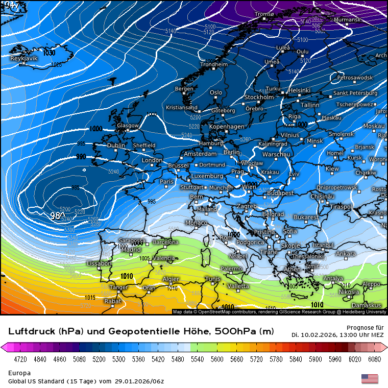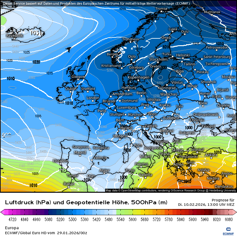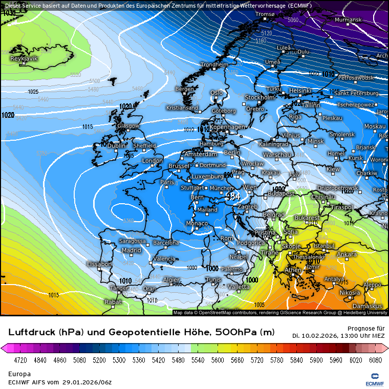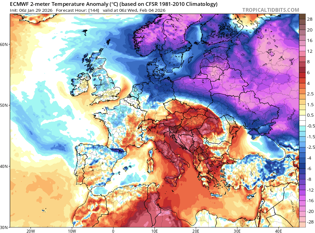 Die Grenzwetterlage zwischen Mildluft im Südwesten und Eisluft im Osten wird gewaltig ... ca. 20 Grad Temperaturunterschied prognostiziert mit + 8 Grad im Südwesten und zeitgleich - 12 Grad an der Grenze zu Polen: Temperatur 02.02.26 um 23 Uhr und offenbar geht es in der ersten Februarwoche auch so ähnlich weiter. Die Temperaturabweichung auf 2m Höhe zeigt einen deutlich zu kalten Norden und einen zu milden Süden. Und eine weitere Reise ins Reich der Spekulationen zeigt aktuell recht einheitliche Modelle: Grönlandblocking macht Platz für einen potentiellen Arctic Outbreak aus Skandinavien. Dem gegenüber eine Tiefdruckzone vom Atlantik bis ins dem Mittelmeer: GFS, ECMWF und KI gestützte ECMWF. Also kein Ost-/Südwestgerangel wie momentan sondern ein potentielles Nord-Süd-Gerangel. Bei dieser Konstellation sind Luftmassengrenzen sehr wahrscheinlich mit entsprechenden Schneepotential. Aber es sei nochmal betont: Es ist noch etwas hin, die Entwicklung hat aber seine Reize im momentan noch Verborgenen