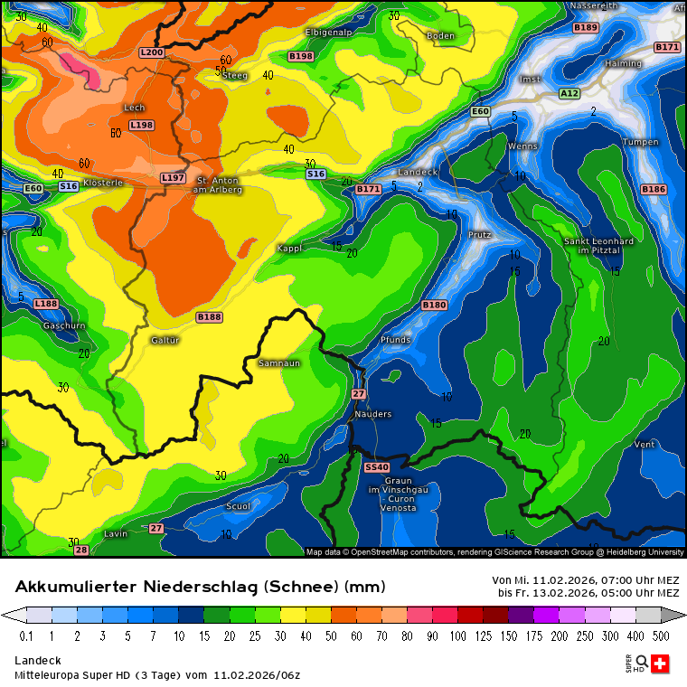 Als akkumulierte Neuschneemenge schaut es bis Do. 12.02. 19 Uhr dann so aus, die Mont-Blanc-Gruppe soll wohl das meiste abbekommen.