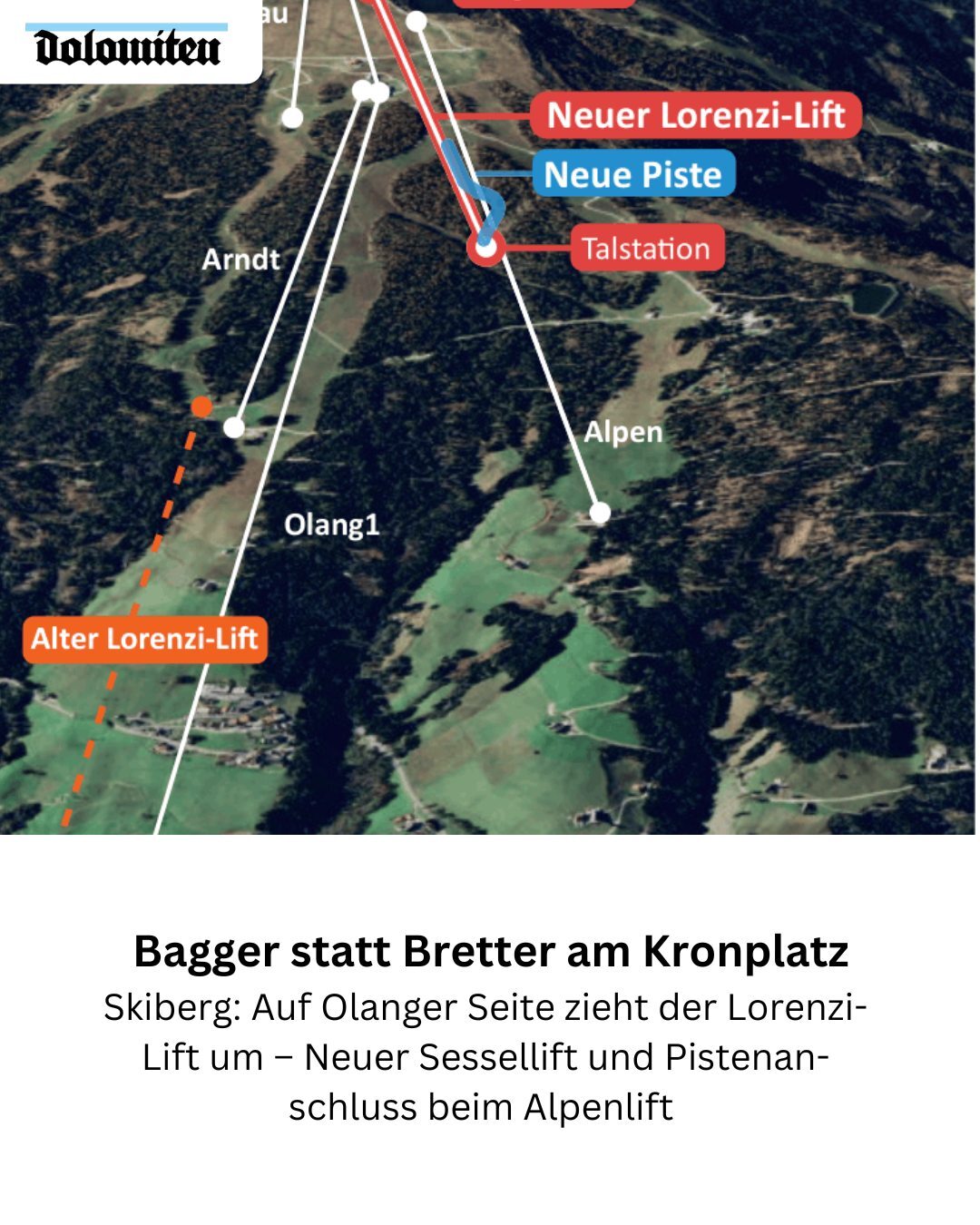 Zu Kronplatz 1+2 nichts Neues. Zu Lorenzi steht folgendes drin:snowflat hat geschrieben: 21.04.2026 - 13:06Quelle: facebookOlang - Am Sonntag verabschiedete sich der Kronplatz in die Sommerpause – doch von Ruhe keine Spur. Während oben der Schnee schmilzt, rollen unten bereits die Bagger an. Auf der Brunecker Seite wird die Kabinenbahn Kronplatz 1+2 erneuert, die Mittelstation verlegt und ein neuer Pistenabschnitt gebaut.