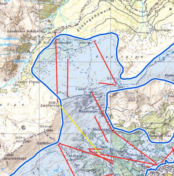 Sollte eigentlich ... zwar liegt die projektierte Bergstation außerhalb der Skigebietsgrenzen (gelb = 2. Sektion), das tut die Bergstation der Almbahn aber auch. Also sollte das kein k.o.-Kriterium sein.basti.ethal hat geschrieben: 24.04.2026 - 11:44 Na dann bin ich mal gespannt, ob diese quasi neue Bahn auf den Zwölferkopf genehmigt wird.