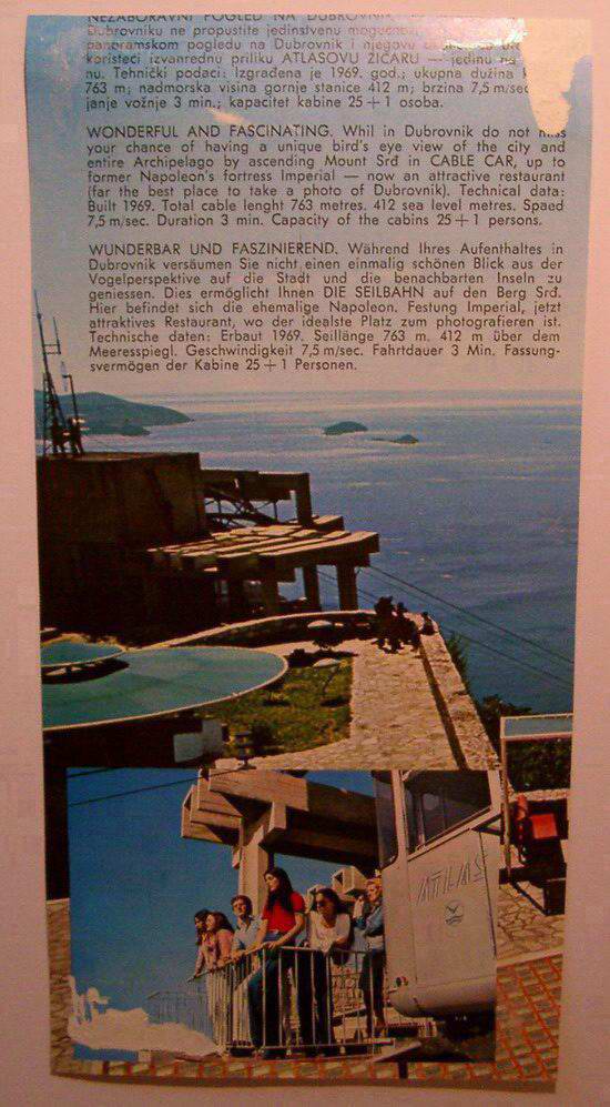 Im Krieg 1992 war die Bergstation in serbischer, die Talstation in kroatischer Hand - das konnte nicht gutgehen! 1998 oder 1999 war ich in Dubrovnik an der Talstation, eine der Kabinen lag beschädigt neben der Talstation, die ist wohl runtergefallen als man die Seile durchgetrennt hat. Die Station selbst sieht zwar verlassen, aber sonst OK aus. Beide Seile sind verschwunden. Nein, Fotos habe ich keine gemacht *obertrottel*