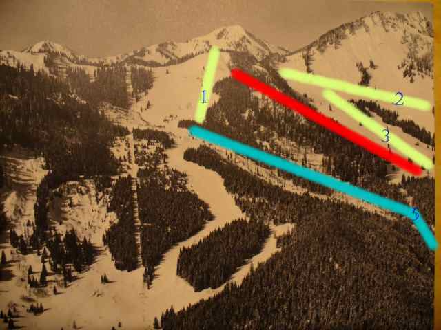damit sich jetzt jeder was vorstellen kann, ein Bild aus dem besagten Buch, die Lifte 1 2 3 sind die damls schon exestierenden Lifte vom kleinen Schizirkus, 1 Osthang, 2 Nordhang, 3 Dreitannen, das rote wär der Javalift gwesen, und das hellblaue ( 5 ) der später gebaute Kurvenlift...