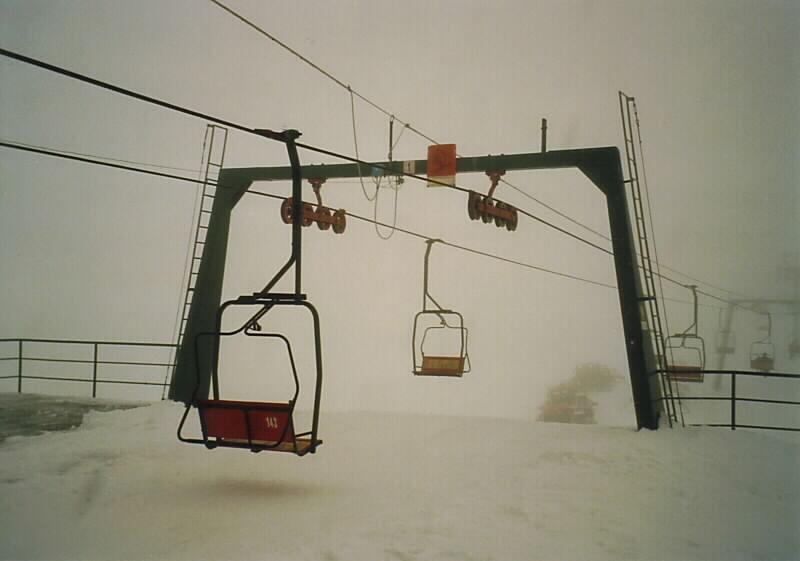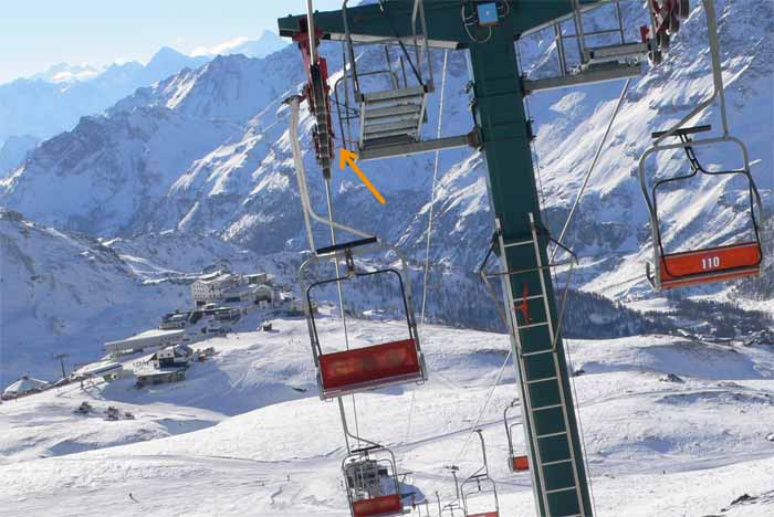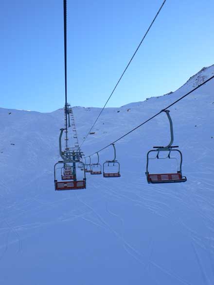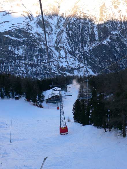 Einmal mit diesem ewig langen fixen 3er durch den Schatten gefahren (21 Stützen) und dann oben 2 Liftbedienstete auf einer Stütze des nicht laufenden Schleppliftes Gran Sometta (h) gesehen. „Öffnet der Lift – und wann?“ frage ich. „In 10 Minuten, aber fahren sie lieber erst noch mal am 3er Sessel“ antwortet der eine Liftler. „Merci bien“ sage ich, aber „nein danke“ denke ich. Diesen Gefrierschrank-3er tu ich mir nicht noch mal an und fahre gleich runter zum Schlepplift. Entscheidung war gut, nach 2 Minuten wird der Lift bereits angestellt.