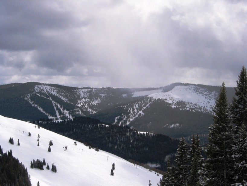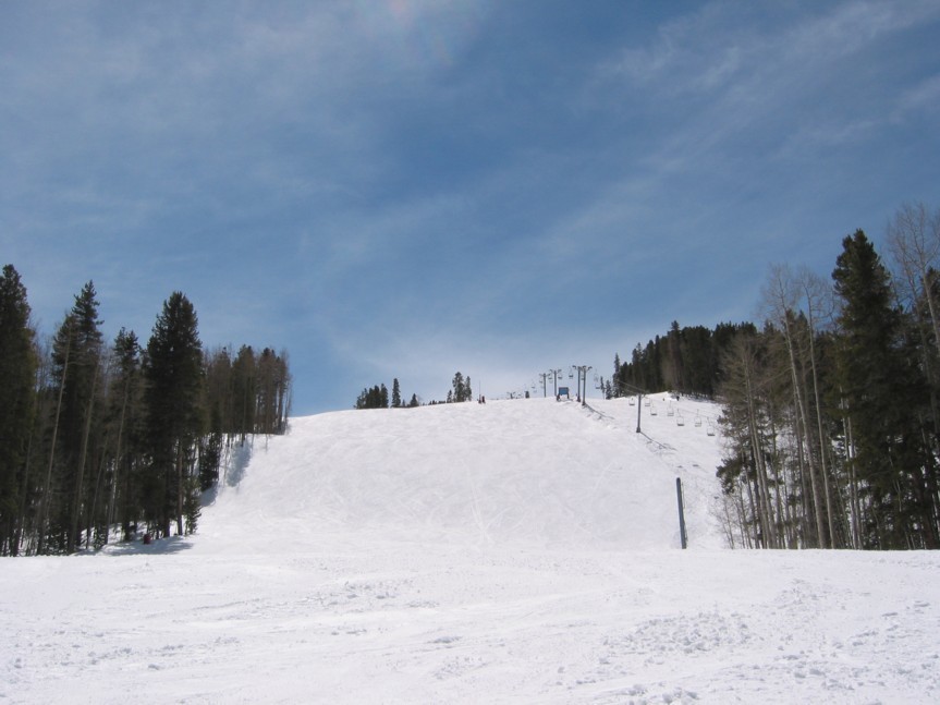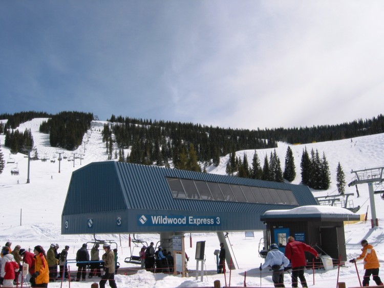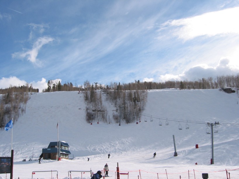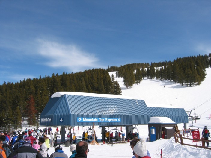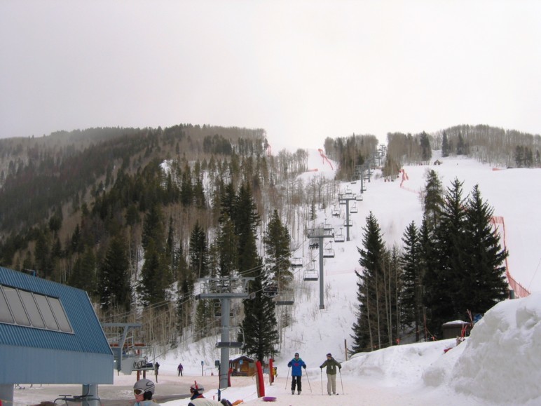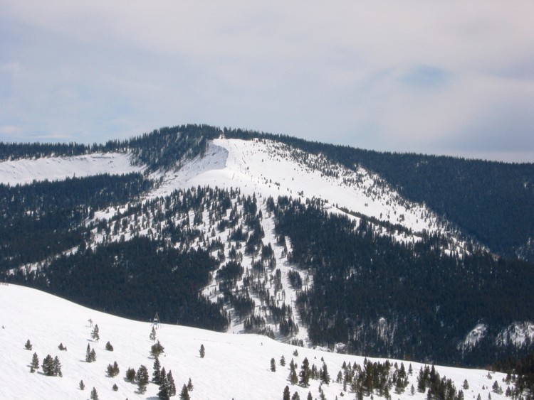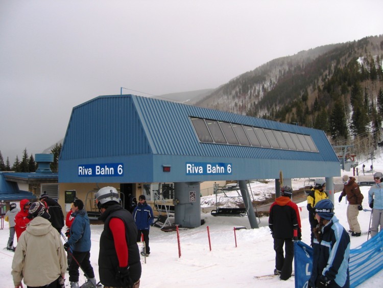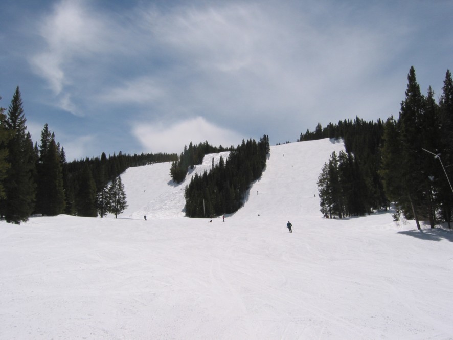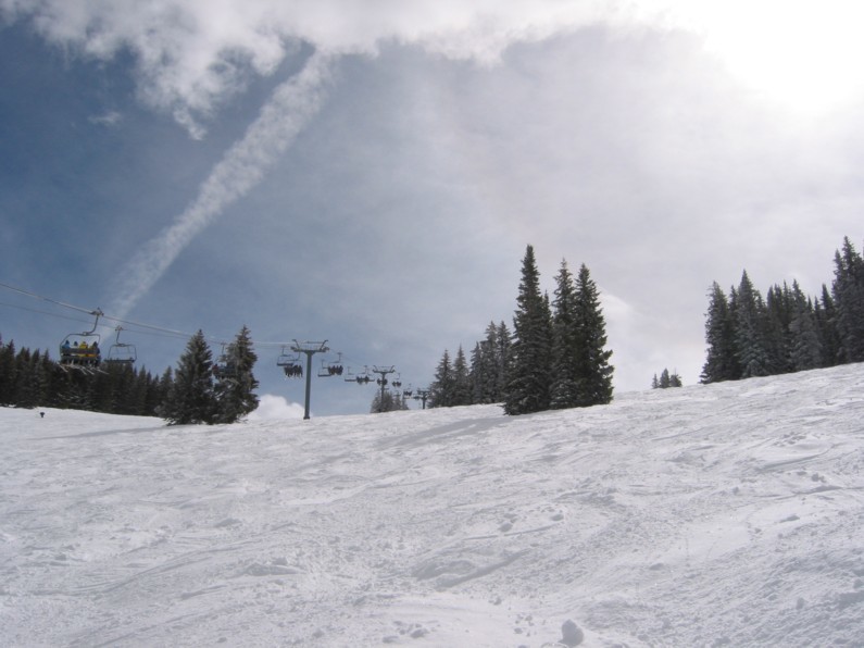 - 4KSB Northwoods Express (473 Hm), 5-7 min Warten, hinauf zum Patrol Headquarter. Als letzte und längste Abfahrt die 4 miles (6,4 km) lange „Riva Ridge“. Super Abfahrt! Erst flache Panoramaeinfahrt, dann abkippender Steilhang (heute alles bucklig!), dann flacher (immer 50+x m breit!), dann die „Tourist trap“, ein kurzer aber richtig heftiger Steilhang (zwischen den Neuschneehaufen nun viel Eis), dann flaches Finale, leider stehen vor der Einfahrt in den Ziehweg Speed-Patroler, die einen zum richtigen Runterbremsen zwingen. „Riva Catwalk“, dann ein schöner Zielhang und Ziehweg zur Vista Bahn. Die Ziehwege sind nicht lang genug, um diese klasse Abfahrt zu vermiesen, die erste richtig große Abfahrt hier in Colorado, alle anderen sind einfach zu kurz bzw. haben nicht genügend Höhendifferenz.