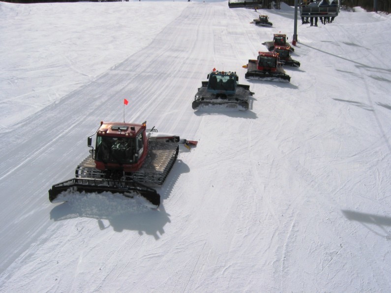 Die Raupen rücken zum noon grooming aus. Geschickterweise werden nicht die bislang ungewalzten Pisten gegroomt, sondern die bereits in der Nacht parkettierte Born free. Aber gute Gelegenheit den Boys bei der Arbeit zu zu sehen (aus der 4KSB Born Free)
