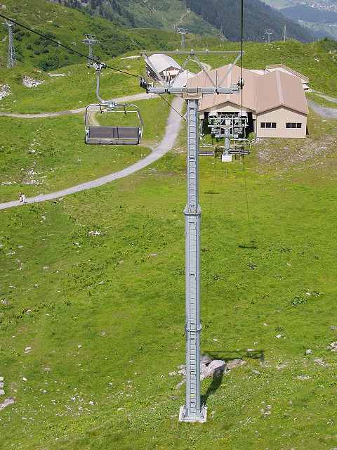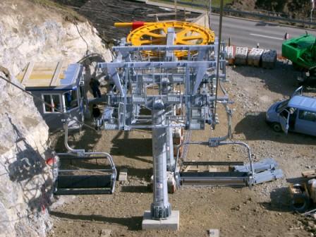 Talstation 4SB Tschainas Celerina. Doppelmayr Stützen und Batterien sowie Sessel. Die Höhner dienen dazu, dass bei einem Rolleverlust die Klemme sich nicht in der Batterie verhängt und diese umdreht.