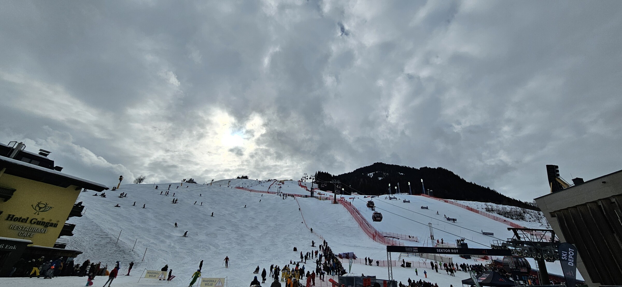 Die Engstelle an der Mittelstation wurde deutlich entschärft da die Damenstrecke am Ausstieg der Zwölferkogelbahn vorbei gestern abgebaut wurde. Wir haben heute zeitweise das Rennen von der Piste aus verfolgt, aber viel sehen tut man dort beim Slalom nicht. Viele störende Werbebanner die einem die Sicht nehmen.