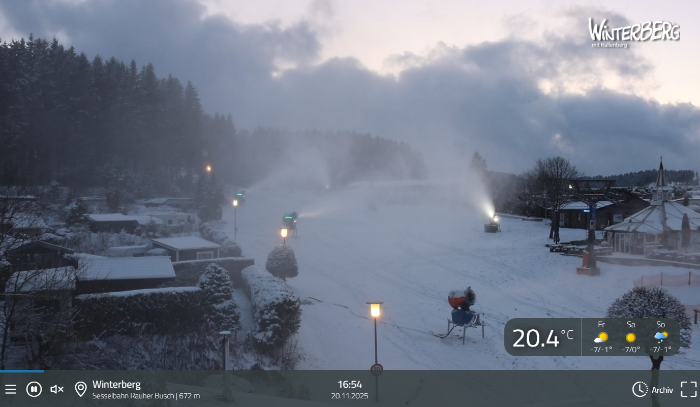 Verwunderlich, dass in Winterberg auf den Webcams keine Aktivität zu erkennen ist, bei um die -2 Grad. Oder die Bedingungen sind trotz der Minusgrade nicht gut genug und man nimmt die noch kälteren Temperaturen in der Nacht?!Dominik B. hat geschrieben: 20.11.2025 - 15:30 Die Postwiese sind die ersten die mit der Beschneiung gestartet haben