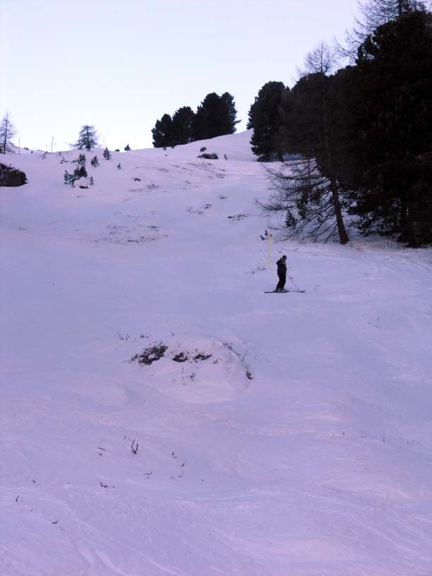 Leichter als Momatt in gewissem Sinne ja, in anderem aber auch nicht, ich halte Hermetji für technisch anspruchsvoller weil in den unteren Passagen enger, man muss präzieser fahren, besonders bei aperen Stellen (hat's eigentlich immer) d.h. der Schwung um den Baum herum muss Genau auf diesen 1.5 m2 sitzen, dann den Kopf einziehen, leicht nach links auf den Innenski legen, um den Ast nicht abzubekommen, die anschliessende Welle irgendwie abfedern und die Ski in den nächsten 2 Buckeln wieder unter Kontrolle bekommen bevor es in dem Stil weiter geht.