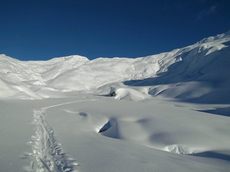 Gut, man hatte nirgends Steine. Wie angesprochen muss man auf der Gauderlochpiste (24) die umständliche, linke Variante nach der alten Schwendi wählen. Schöditaz hat sich aber durch den Tiefschnee gewagt und es ging eigentlich ganz gut, aber die Schneedecke dort ist schon noch dünn.