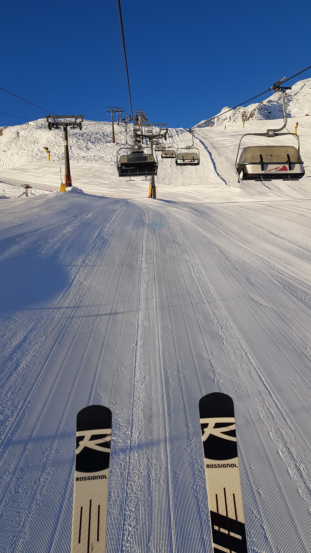 Fands heute in Sölden tatsächlich fast angenehmer als in Gurgl gestern, da die Pisten einfach (schon) wesentlich breiter sind, vor allem an den Gletschern. Dadurch etwas mehr Platz auf den Pisten. War der erste oben im Silberbrünnl. Die erste drei, vier Abfahrten noch herrlich ruhig mit tollem Licht. Auch danach war ich nur selten an Liften mit langen Wartezeiten, an manchen wie Stabele, Langegg, Karleskogel oder Hainbachkar konnte ich direkt durchgehen. War allerdings auch immer etwas vor der Masse unterwegs.