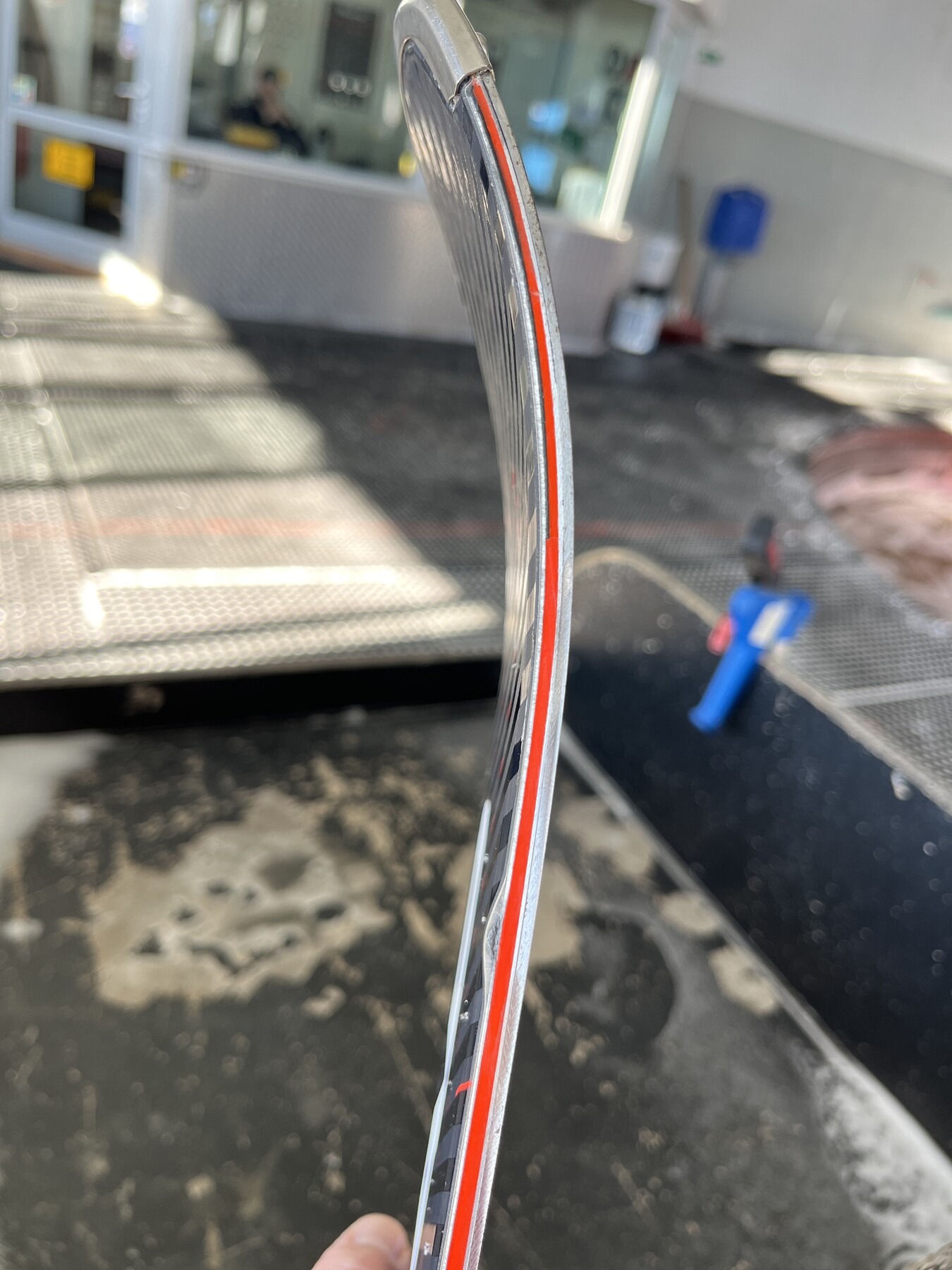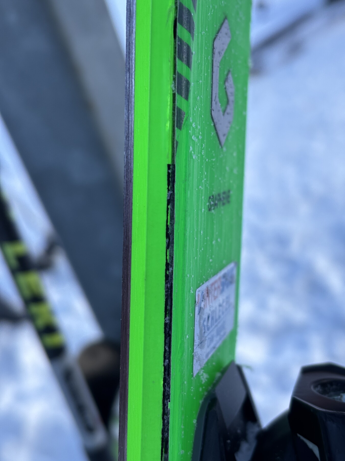 Nachdem ja im letzten Jahr der rechte Ski im vorderen Bereich an der Deckfläche aufgerissen war, sind nun beim linken Ski an der Außenseite im hinteren Bereich zwei Aufbrüche entstanden.