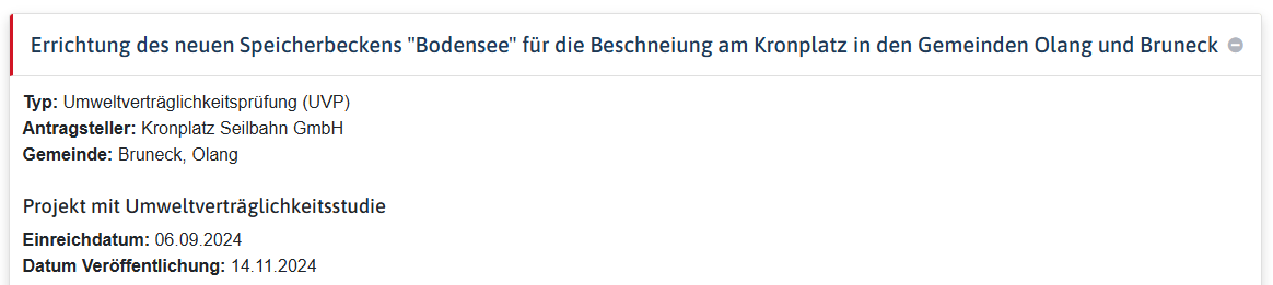 Es ist für die neue "RUIS" keine UVP notwendig: Erneuerung der Aufstiegsanlage RUIS in der Gemeinde Enneberg - Feststellung der UVP-Pflicht („Screening“)snowflat hat geschrieben: 22.02.2025 - 22:37Quelle: Umweltvorstudie Erneuerung der Aufstiegsanlage RUIS in der Gemeinde Enneberg1.1. Einführung
