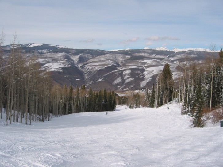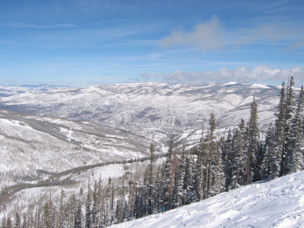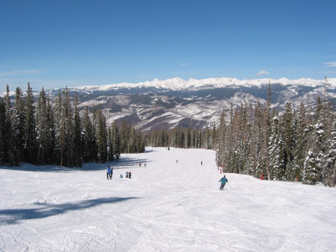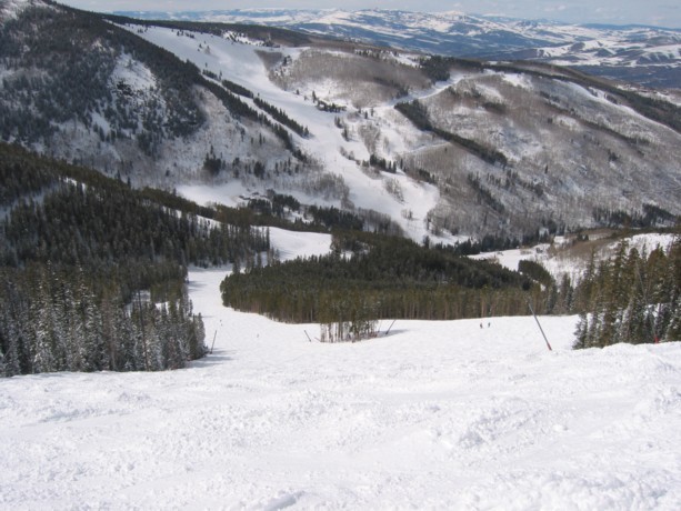 - DSB Drink of water (250 Hm), sympathische DSB von DM die flach und malerisch bis auf den 3488 m hohen Beaver Creek Mountain zieht, von dem man aus eine prachtvolle Aussicht auf die Felsenberge der Gore Range und die Bowls von Vail hat, die mir am Di noch gar nicht aufgefallen waren. Fahren die aller äußerste Abfahrt, die wunderschöne „Red Buffalo“, dann „Cinch“ zur Spruce Saddle Lodge und als Talabfahrt die „Latigo“, die fünfte Spitzentalabfahrt von hier (Gold dust, Centennial, Harrier, Red tail, Latigo), viele schöne Hangkombinationen, durchaus abwechslungsreich kombiniert, unten dann flaches Auslaufen auf der „Haymeadow“.