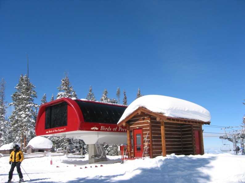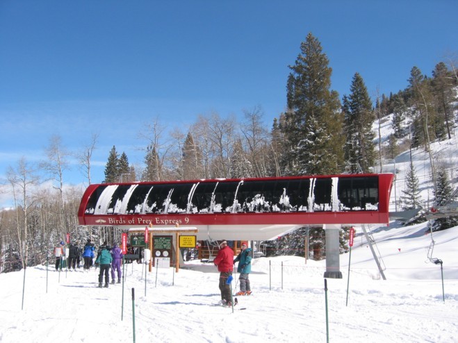 - 4KSB Birds of Prey Express (658 Hm), Baujahr 2003, DM Uni-G. Zieht direkt die Westfall hinauf bis auf 3350 m. Fahren sofort die „Peregrine“, die double-diamond direkt unter dem Lift: mega steil, toller Pulver, nur wenig bucklig. Zum Fahren ein Gedicht aber sehr anstrengend! Kommen aber sturzfrei durch.