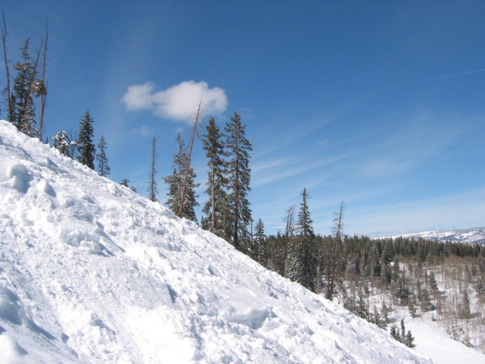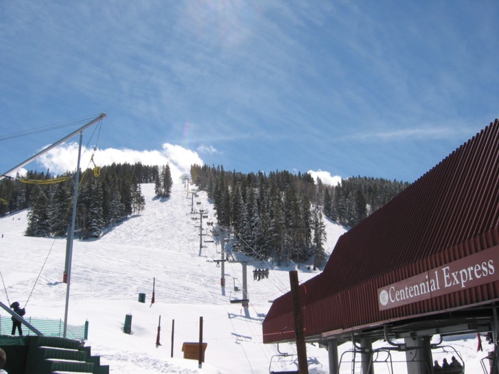 - 3SB Rose bowl (407 Hm), gemessen 2860-3267 m, klassischer DM 3er, vergleichbar 3SB Penken. Auch dieser Lift als KSB wäre eine deutliche Verbesserung. Über die „Sheephorn“ wieder auf die „Centennial“, diesmal als Schlusshang die „1876“, noch besser, ideales Carving-Gelände, es firnt unten auf, eben deutlich tiefer als die Summit Resorts, ein Hauch von Frühlingsstimmung.