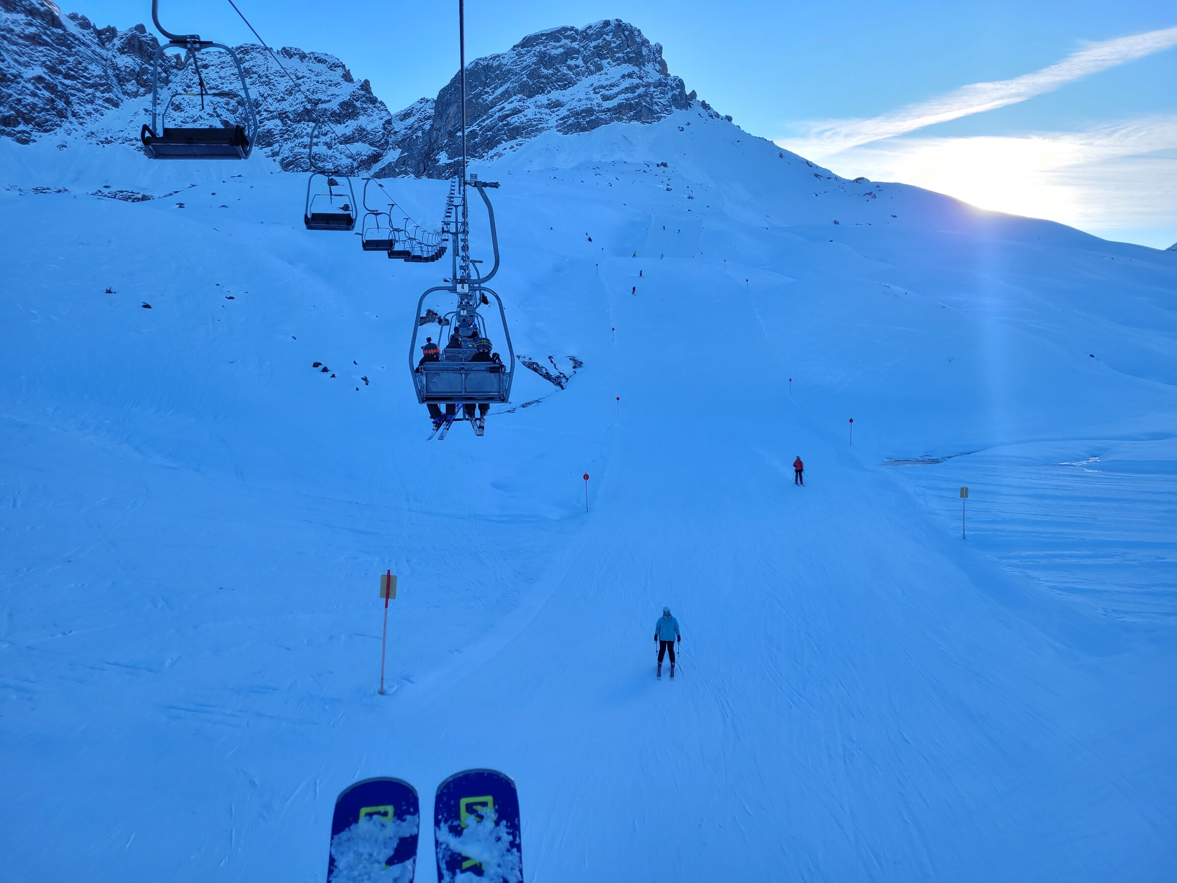 Würde am liebsten abreisen, aber es ist ja Urlaub. Und in Kombination mit dem sehr schönen Wetter macht man halt zwei Mal Station im Salome (Oberlech), sonnt sich, dazu gutes Essen mit einem klasse Pano, gleicht sich das wirklich schlechte Angebot wieder aus. Wer nur zum Skifahren kommen will, sollte zu Hause bleiben oder nach Ischgl fahren.