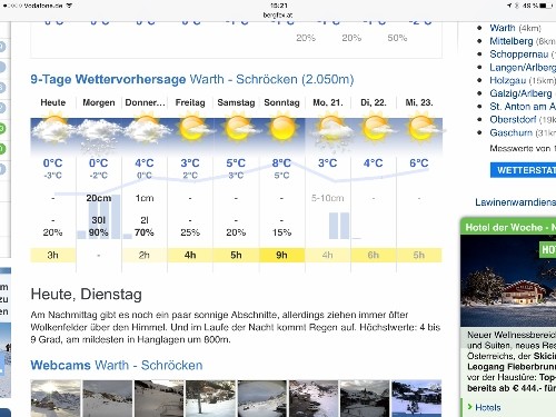 Bergfex sieht jetzt immerhin 20 cm Neuschnee morgen am Arlberg auf 2000 m und leicht gesunkene Schneefallgrenze. Nicht die Welt, aber jeder cm zählt.