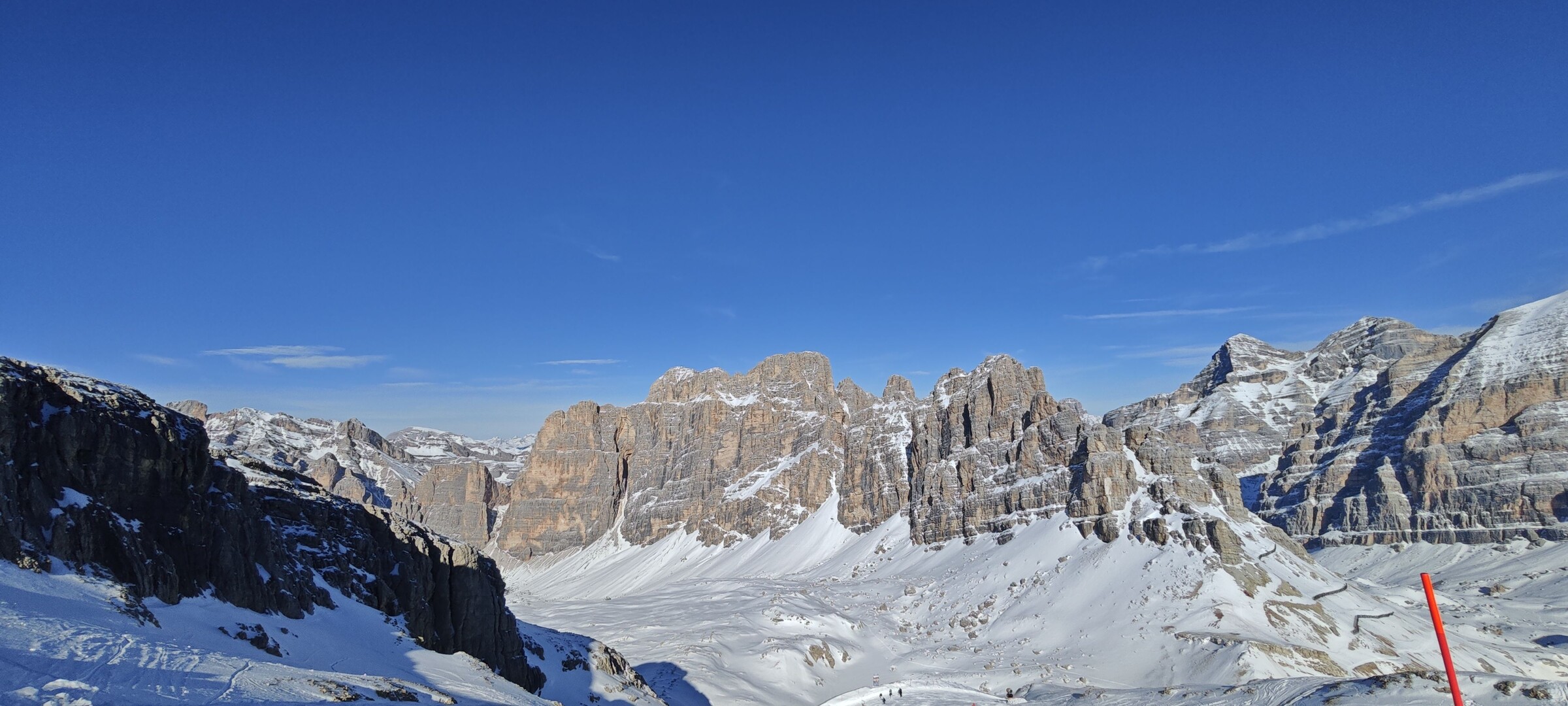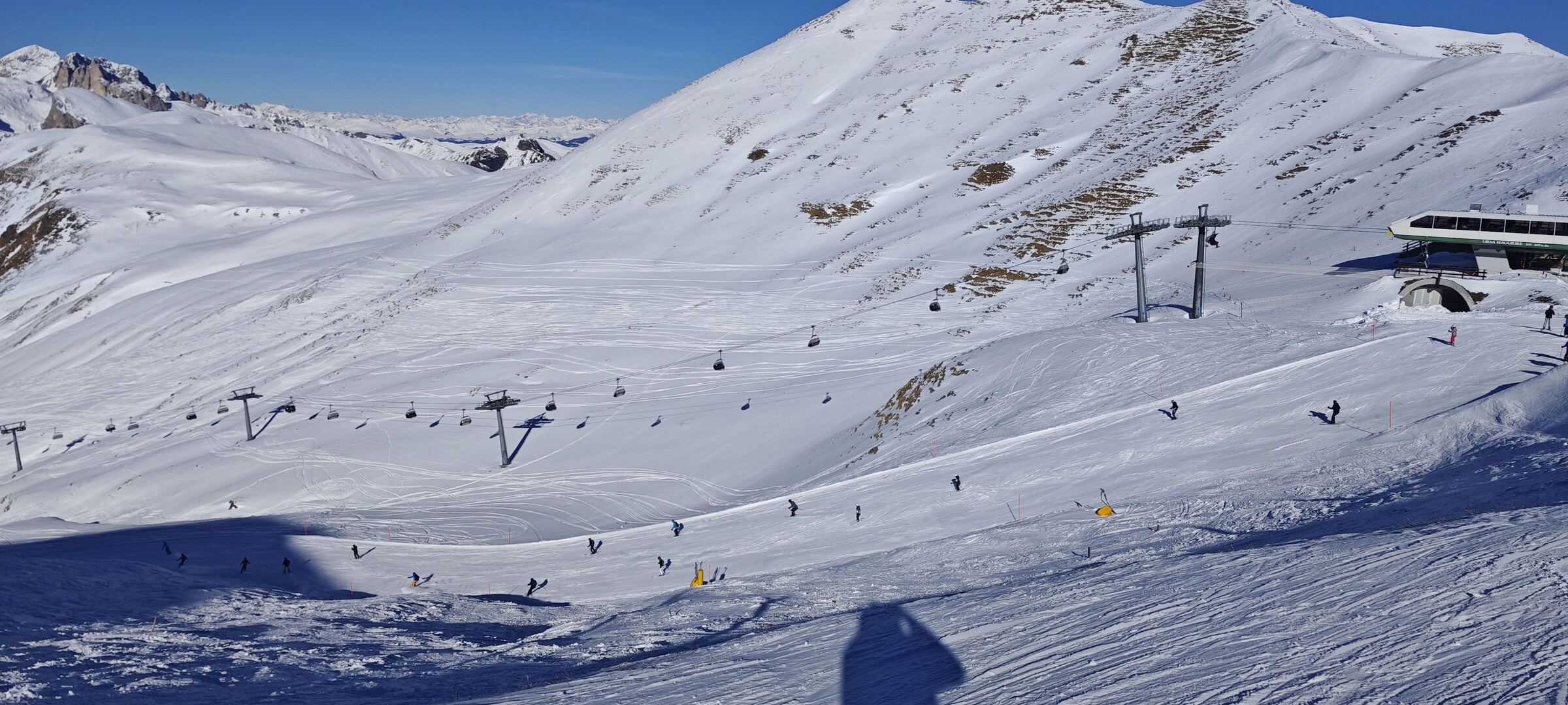 Val di Fassa Richtung Pera di Fassa. Jetzt ist Hauptsaison. Morgen nochmal Richtung Cortina. Da sind nur alle Anschlusspunkte mit 10-20 Minuten Wartezeit. Weiterhin überall voll. Man findet trotzdem traumhafte Abfahrten und ich fahre so viel wie möglich.