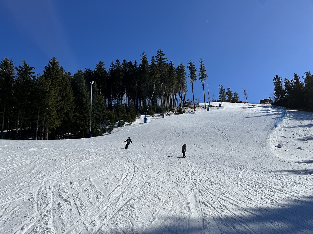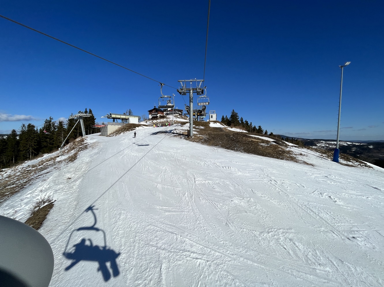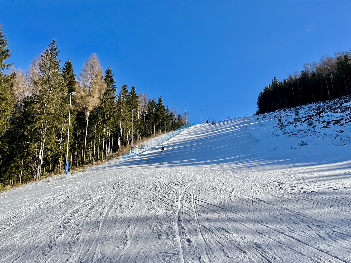 Kurzes Update vom Plesivec am gestrigen Mittwoch: Schnee am Morgen hart gefroren aber nicht eisig. Wir haben erst eine Stunde mit dem kleinsten Familienmitglied im sehr schönen Kinderland verbracht und sind gegen 10.30Uhr auf die Pisten. Gute Entscheidung, denn dann firnte es bei +1°C und strahlend blauem Himmel bereits auf, was eine wunderbar "cremige" Auflage bildete. Nur im Bereich der Talstation an der 4KSB "Mercedes Benz" (ehem. Pstruzi) war es nach dem Mittag zu langsam und man kam nur mit sehr viel Schwung aus der Piste 1 ohne Anschieben bis zum Lifteinstieg. Schattige Bereiche blieben dagegen fest und schnell, also sehr unterschiedlicher Schnee wie man es eher im März oder April erwartet. Schnell ging es auch durch die Drehkreuze, wir brauchten nie länger als 1 oder max. 2min und oft ging es ohne Anstehen direkt in den nächsten Sessel. Ein totaler Luxus mitten in den Winterferien bei Sonnenschein!