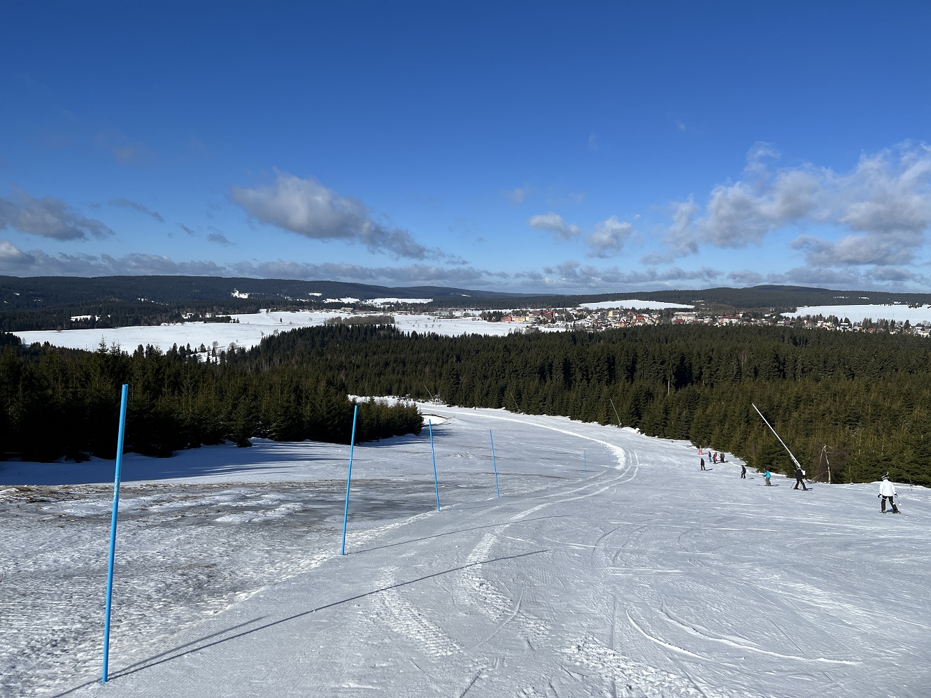Der steile Starthang der " 4 " war super präpariert. Ist für mich die schönste Piste am Plesivec. Das Skigebiet war gut gefüllt mit Familien, in Tschechien sind wohl noch Ferien. Und auch einige Holländer waren da. Wartezeiten an den Liften gab es aber nur punktuell und temporär, und dann auch nur max. 3 min. an der KSB " Modesgrund".