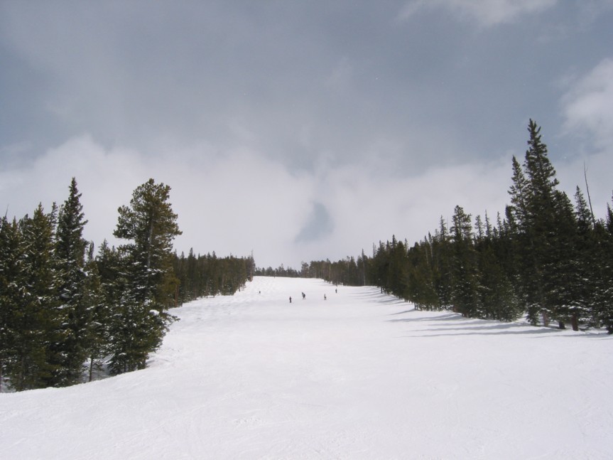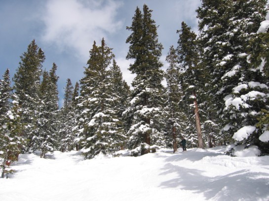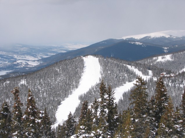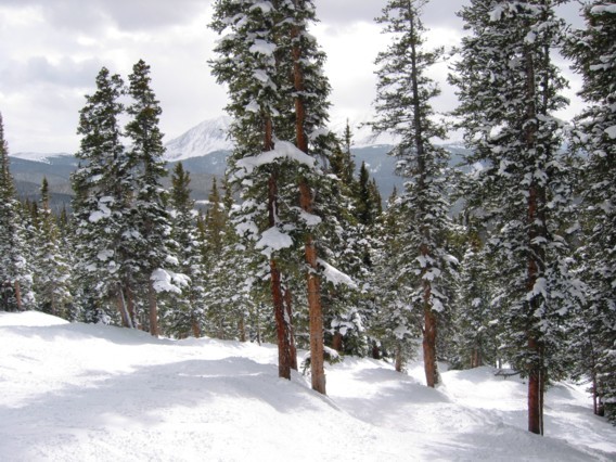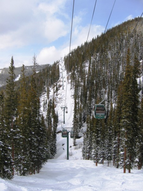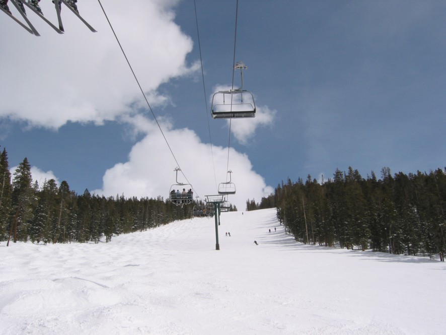 - 4KSB Outback Express (452 Hm) x 3: hier einiges los, bei 2 gewalzten und dutzenden ungewalzten Abfahrten verteilt sich jedoch alles bestens. Höchster Punkt des Skigebietes auf 3645 m, tolle Aussicht über das Summit County, die Great Divide und hinüber ins nahe Breckenridge. Abfahrten „Elkhorn“ und „Porcupine“, eine besser als die andere, dann die „Wolverine“/“Lodgepole“, eine Schwarze, die mitten durch ziemlich dichten Wald hindurch führt und uns einen riesen Spaß macht, Tree-Skiing par excellence.
