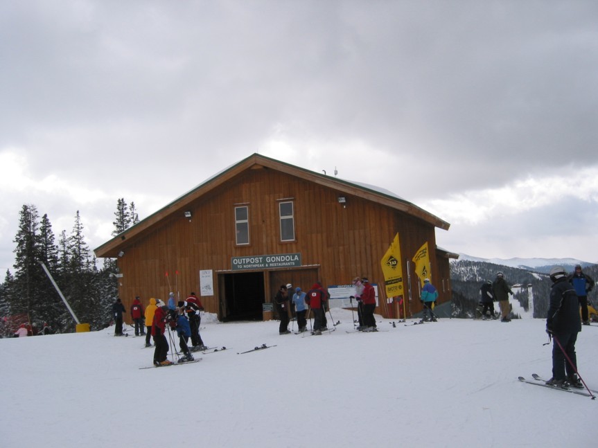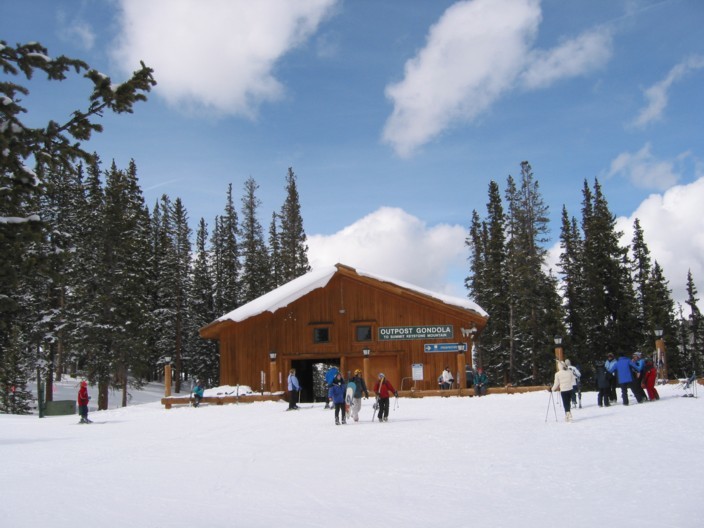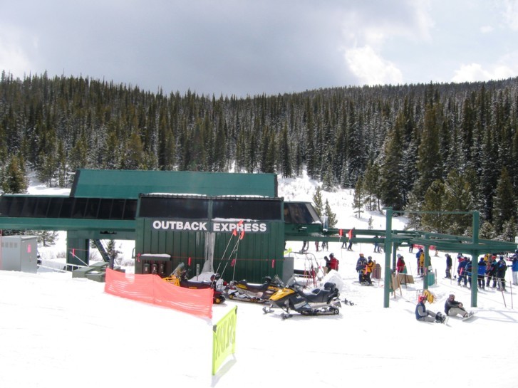 Kurz vor ihrer Talstation startet die 4KSB Outback (1991, DM) hinauf zum dritten Skiberg, dem bis auf 3645 m erschlossenen Outback, der ein herrliches Panorama bietet: im Südwesten das komplette Skigebiet von Breckenridge wo man wirklich jede einzelne Schneise erkennen kann, dann im Nordwesten das riesige Dillon Reservoir und viele weitere 3000er und 4000er. Skitechnisch bietet der Outback für Normalskifahrer die beiden gewalzten blauen „Elk-Run“ und „Porcupine“ (übrigens das „Stachelschwein“), beide teilweise ordentlich steil (bei uns rot, manche Gebiete schwarz). Beim Elk-Run besonders schön, auf der rechten Seite werden zwei Walzenbreiten nicht gewalzt sondern als Buckelpiste belassen, so kann man ohne Aufwand schnell zwischen Piste und Buckeln wechseln und für die anderen Abfahrten am Outback üben, die reine Buckelschneisen wie „Big-Horn“ oder „Oh Bob“ oder die Treeskiing-Revier sind (schwarz markiert und unten mit Ziehweg, der zur Talstation zurückführt, aber eben einfach nur recht dichter Wald, durch den sicher jeder selbst einen Weg finden darf und einige freigelegte Wurzeln und Steine zur Vorsicht anraten. Aber schnell fährt hier sowieso niemand, der Hauptspass beim Treeskiing ist das langsame nach unten tasten durch teilweise unverspurten Pulver) wie z.B. die „Wolverine“ (Vielfraß), die wir z.B. gefahren sind (Südseite). Auch die Nordseite des Outback hat coole Abfahrten wie unseren Liebling, den „Timberwolf“. Oben eher flaches Treeskiinggelände, weiter unten wurde eine direkte Schneise ausgeholzt, ziemlich steil und total buckelig, ideales Trainings- und Übungsgelände für jeden, der sich beim Buckelpistefahren verbessern möchte, dazu in der sportmedizinisch günstigen Höhe von über 3200 m. Freies Tiefschneegelände gibt es auch, die North und South Bowl, man muss aber mit dem Outback Cat Shuttle hinauffahren oder per pedes/Felle. Haben wir jetzt in diesem Fall nicht ausprobiert. Sind am North Peak schon wenig Anfänger, sind Experten am Outback vollkommen unter sich.
