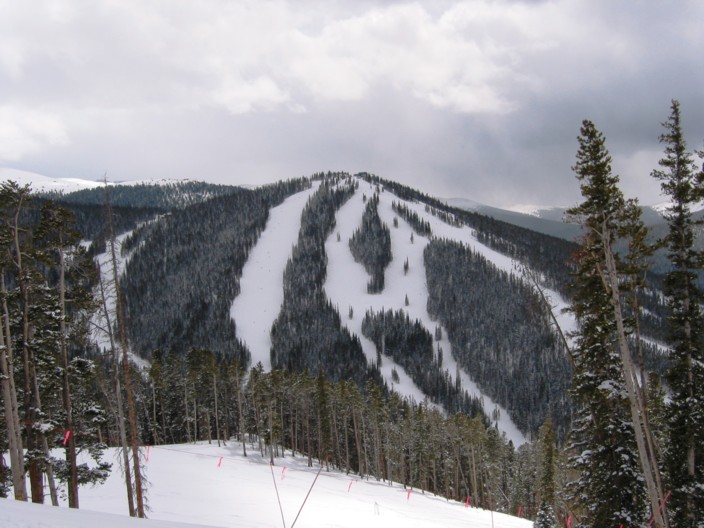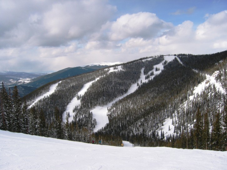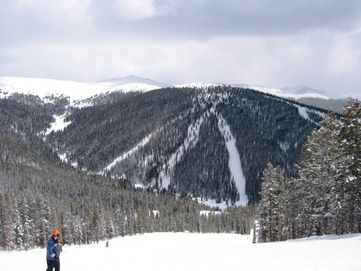Der Aufbau des Gebietes ist denkbar einfach: von Norden nach Süden erstrecken sich drei in etwa gleich hohe abgerundete Skiberge, ganz leicht versetzt. Im Norden der Keystone oder Dercum Mountain, 3548 m (benannt nach Max Dercum, dem Gründer von Keystone), direkt vom Ort aus erreichbar, die reine, 700 Hm hohe Nordflanke ist der Kern des Skigebietes und von einem undurchschaubaren Netz von Waldschneisen durchzogen. Hier findet auch der Nachtskilauf statt. Vom Ortsteil River Run erschließen die 6EUB River Run (von Roll, 1986) und die parallele 4KSB Summit Express (DM, 1997) den gesamten Skiberg, vom westlichen Ortsteil „Mountain house“ starten die 4KSB Peru Express und die DSB Argentine (praktisch nie mehr in Betrieb, da kein Bedarf). Der Peru Express erreicht zwar den Kamm, aber nicht den Gipfel. Um vom Peru Express auf den Gipfel zu gelangen fährt man ein gutes Stück ab und nimmt die 4KSB Montezuma Express um auf den Keystone Mountain zu gelangen. Der Montezuma-Express bedient auch als Beschäftigungsanlage die schönsten Abfahrten im oberen Bereich, die Talbereiche sind nicht so gut und vielfältig wie die oberen Abschnitte. Die 6EUB und die 4KSB Peru sind wochentags bis 8pm in Betrieb, am Fr und Sa bis 10pm, die 4KSB Montezuma ist am Fr und Sa bis 6pm in Betrieb. Wer um 9am am Lift ist, kann seine Liftkarte also 11 Stunden am Stück ausnutzen, auch ein Rekord! Die Nordflanke des Keystone-Mountain weist zu 90-95% leichte und mittelschwere Abfahrten auf, die beiden schweren Abfahrten liegen im unteren Abschnitt des Peru-Express und sind auch ordentlich steil, aber gewalzt. Auf nicht-gewalzten Abfahrten am Dercum Mountain kann man schön Buckelpiste üben. Die Grünen wie der 3,5 miles lange „Schoolmarm“ (angeblich längste grüne Abfahrt der Welt) sind wie in Copper so angelegt, dass sie ohne Schieben aber mit viel Spaß vonstatten gehen, viele Blaue sind richtig rassig und trotz der Parallelität alle irgendwie anders und gehören zu den flottesten, leersten und schönsten Carving-Pisten die ich kenne („Springdipper“/“Flying Dutchman“/“Frenchman“/“Wild Irishman“/“Paymaster“), unten dann hinein in den ordentlich steilen Schlusshang „River run“, dann hat man die 700 Hm flott und rasant hinter sich gebracht.