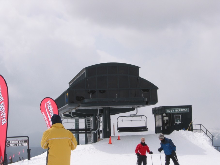 Die Südflanke des Keystone/Dercum Mountain bringt dann eine blaue Verbindungsabfahrt, die oben und unten aber sehr schön breit ist und viel Freude bereitet, die „Mozart“, dann die beiden schwarzen „Diamond back“ (gewalzt, toll und leer!) und „Mine-shaft“ (trotz sichtbarer Schneilanzen nur Gras, geschlossen!). Als Rückbringer dient die 6KSB Ruby Express (Poma), ein kapazitätsstarker Bagger mit 3600 p/h.