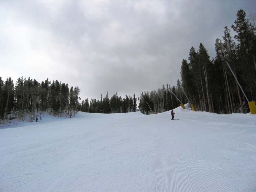 wenn ich mich richtig erinnere 53 inches mid mountain base. Vom Schnee her ist Keystone nicht gerade verwöhnt, hat in den Schneeberichten der Vail Resorts immer am wenigsten Schnee. Das sieht man auch sofort an allen nicht beschneiten und gewalzten Abfahrten die dann manches Grünzeug aufweisen, bzw. wie die beiden schwarzen „Last Hoot“ und „Mine shaft“ nur aus Gras bestehen, trotz Beschneiungslanzen auf beiden Abfahrten, was mir ein Rätsel ist. Anlage nicht benutzt? „Mine Shaft“ ist zumindest praller Südhang, vielleicht deshalb. Die parallelen „Mozart“ und „Diamond back“ sind jedoch tipp topp, keine Ahnung warum also. Im Tiefschneebereich am Outback gabs wie erwähnt einige Steine und Wurzeln, die aber immer gut sichtbar waren und die man durch das Wählen einer neuen Route durch den Wald getrost links oder rechts liegen lassen konnte. Die gewalzten Abfahrten sind jedoch 1A und das dank der geringen Anzahl von Skifahrern pro Abfahrt auch noch am späten Nachmittag, etliche Abfahrten werden auch spätnachmittags für den Nachtskilauf gewalzt, deshalb hat man dann teilweise nochmals frühmorgendliche Bedingungen. Das Wichtigste aus meiner Sicht: die Qualität des Schnees war immer 1A super pulvrig und das Mitte März: weder Sulz noch Firn! Wie ich gerade aus euren März-Berichten entnehme, war das ja in den Alpen nicht wirklich so. Dazu kommt, dass sich aus dem trockenen Colorado-Pulver praktisch keine größeren Buckel herausfahren (wenn, kann man locker durchcarven) und diese im Allgemeinen auch nicht herausgefahren werden, da die Abfahrten durchweg leerer als in den Alpen sind. Präparation übrigens 1A. Selten so tolle „Autobahnen“ gefahren wie „Dutchman“ am Morgen und „Frenchman“ am Nachmittag.